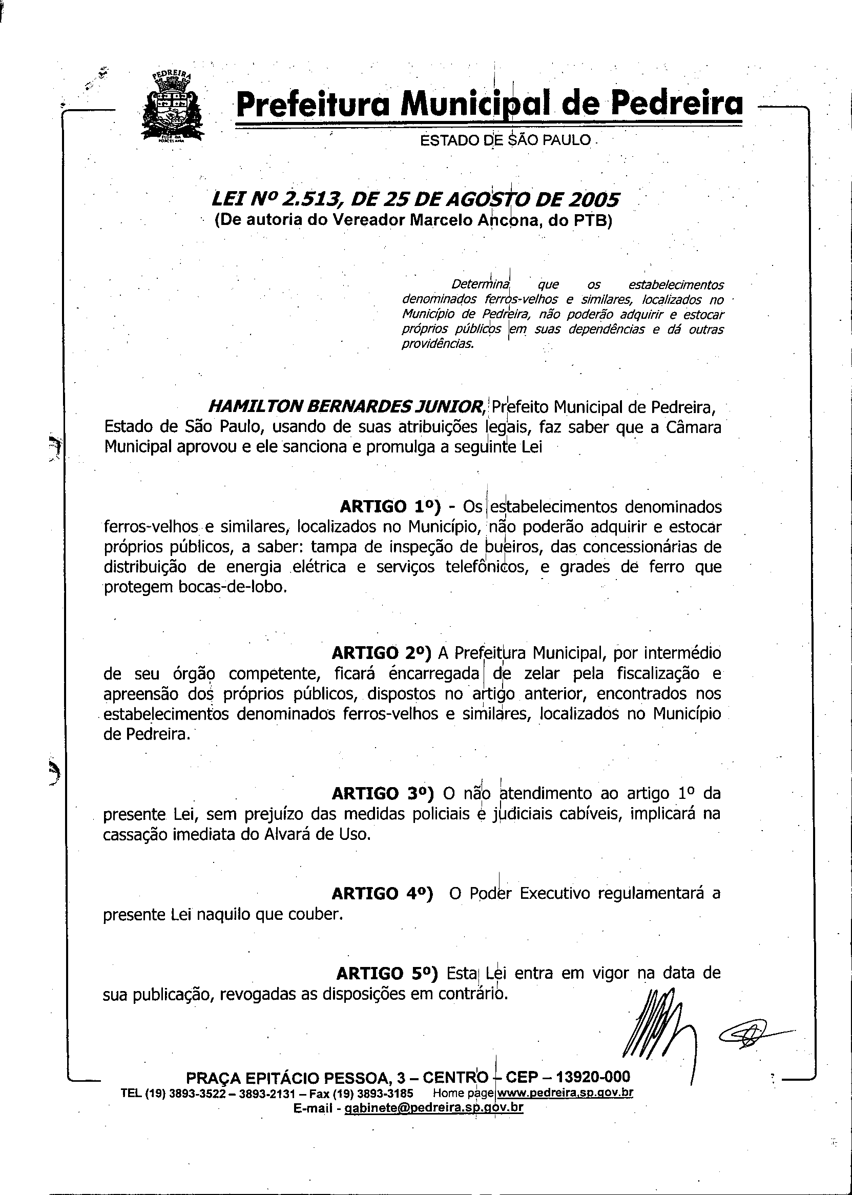 Ementa: Determina que os estabelecimentos denominados ferros-velhos e similares, localizados no Município de Pedreira, não poderão adquirir e estocar próprios públicos em suas dependências e dá outras providências.