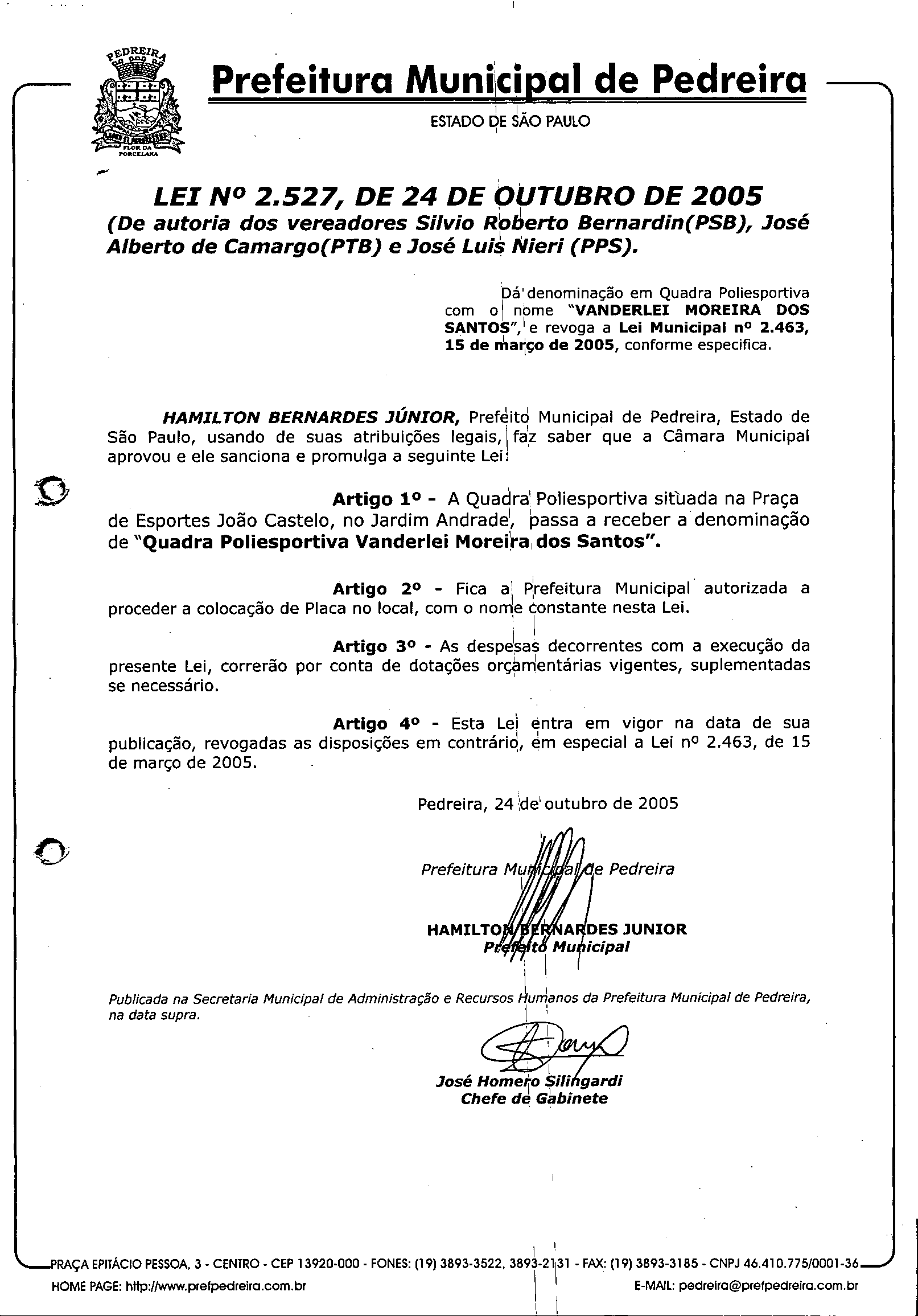 Ementa: Dá denominação em Quadra Poliesportiva com o nome "VANDERLEI MOREIRA DOS SANTOS",' e revoga a Lei Municipal n° 2.463, 15 de março de 2005, conforme especifica.