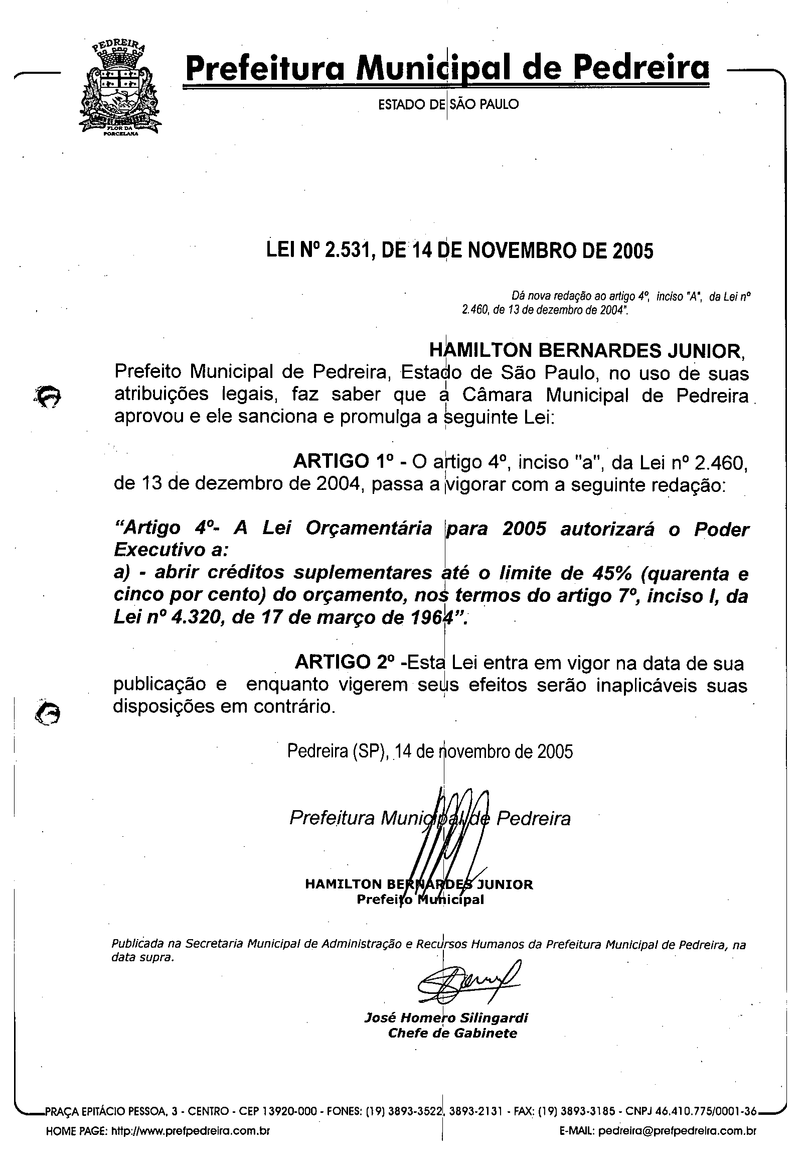 Lei Municipal - N° 2531 de 14/11/2005