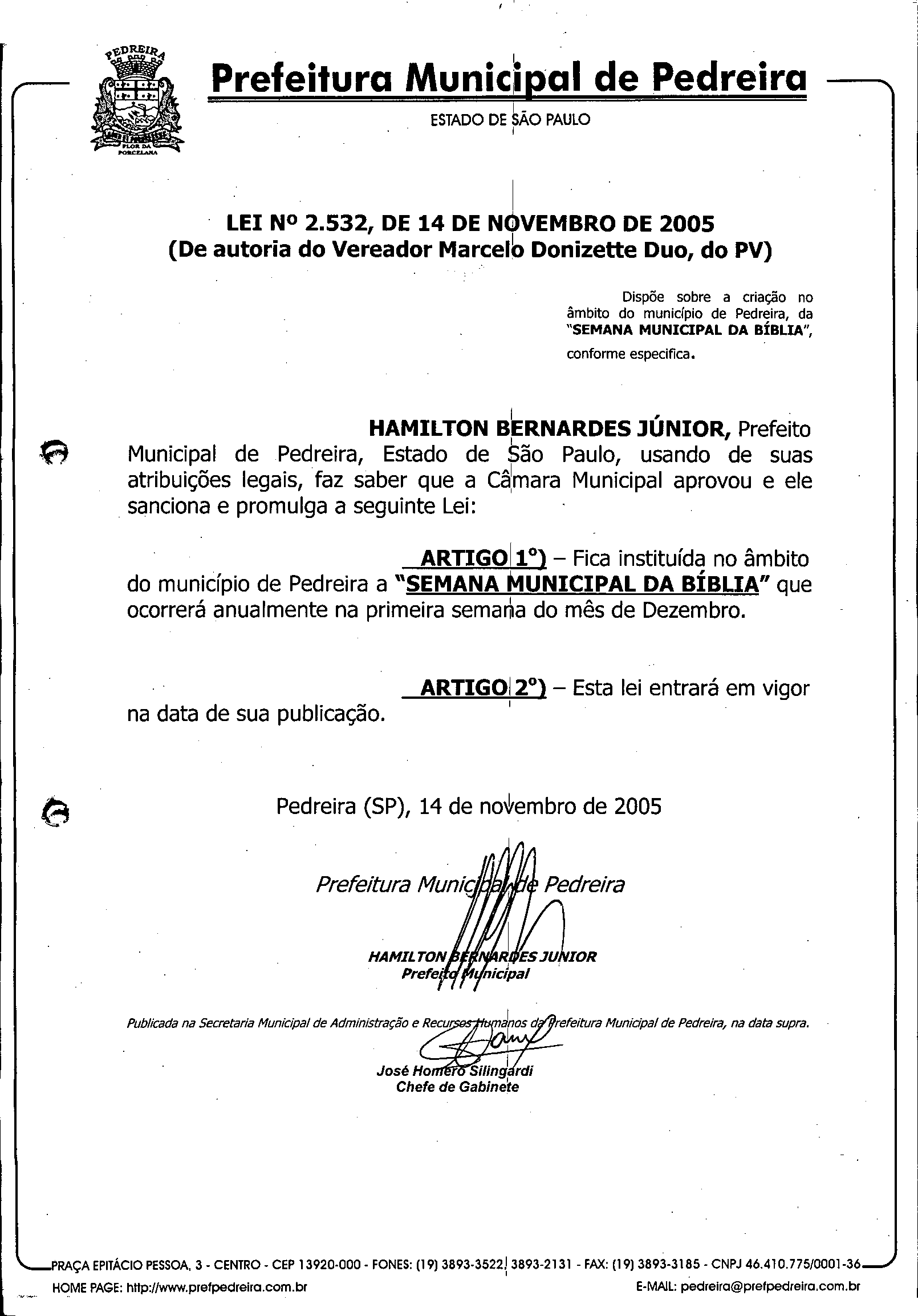 Ementa: Dispõe sobre a criação no âmbito do município de Pedreira, da "SEMANA MUNICIPAL DA BÍBLIA", conforme especifica.