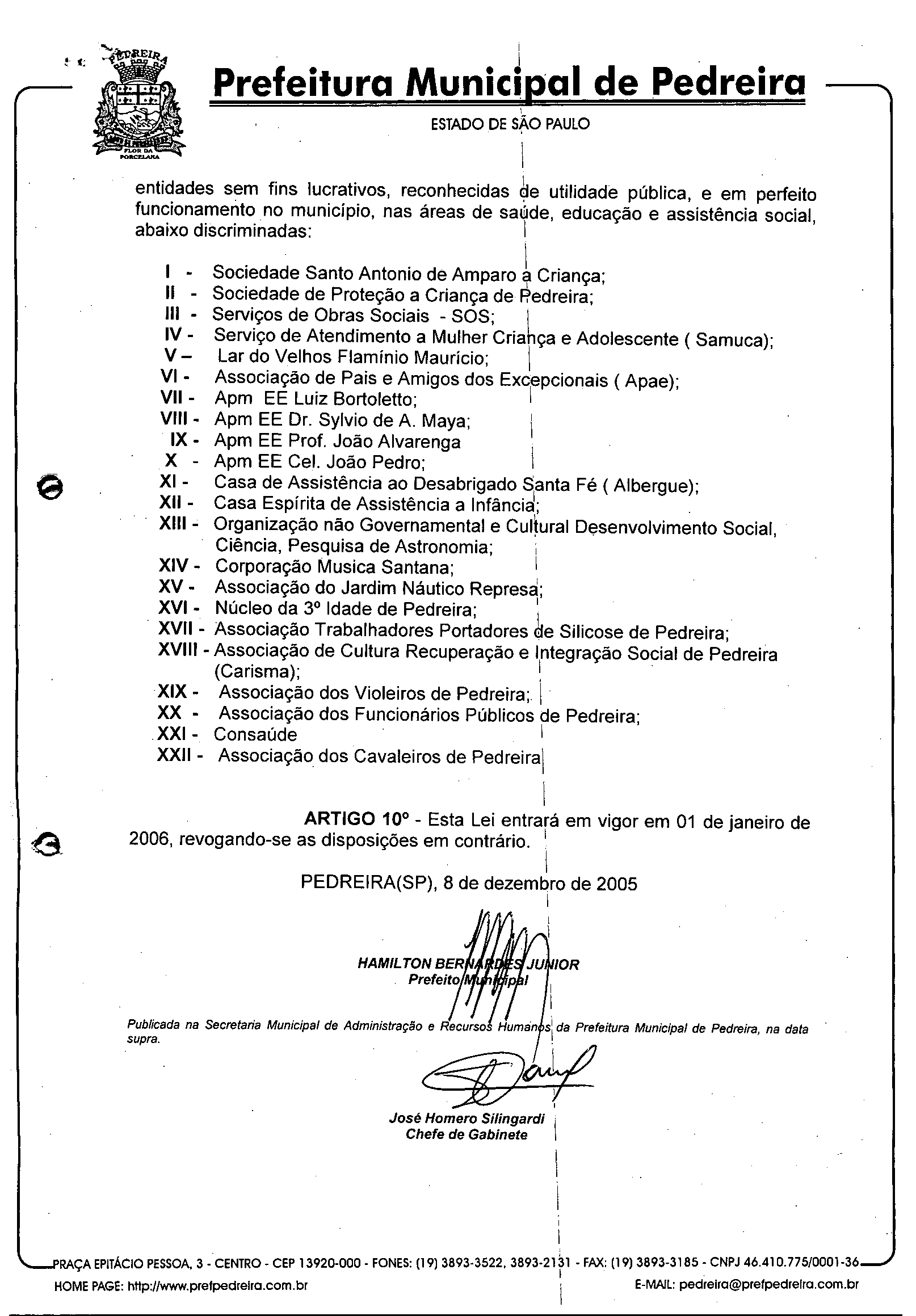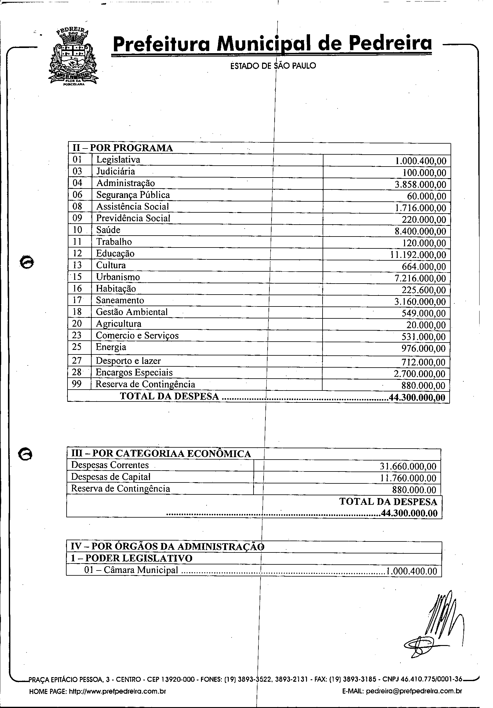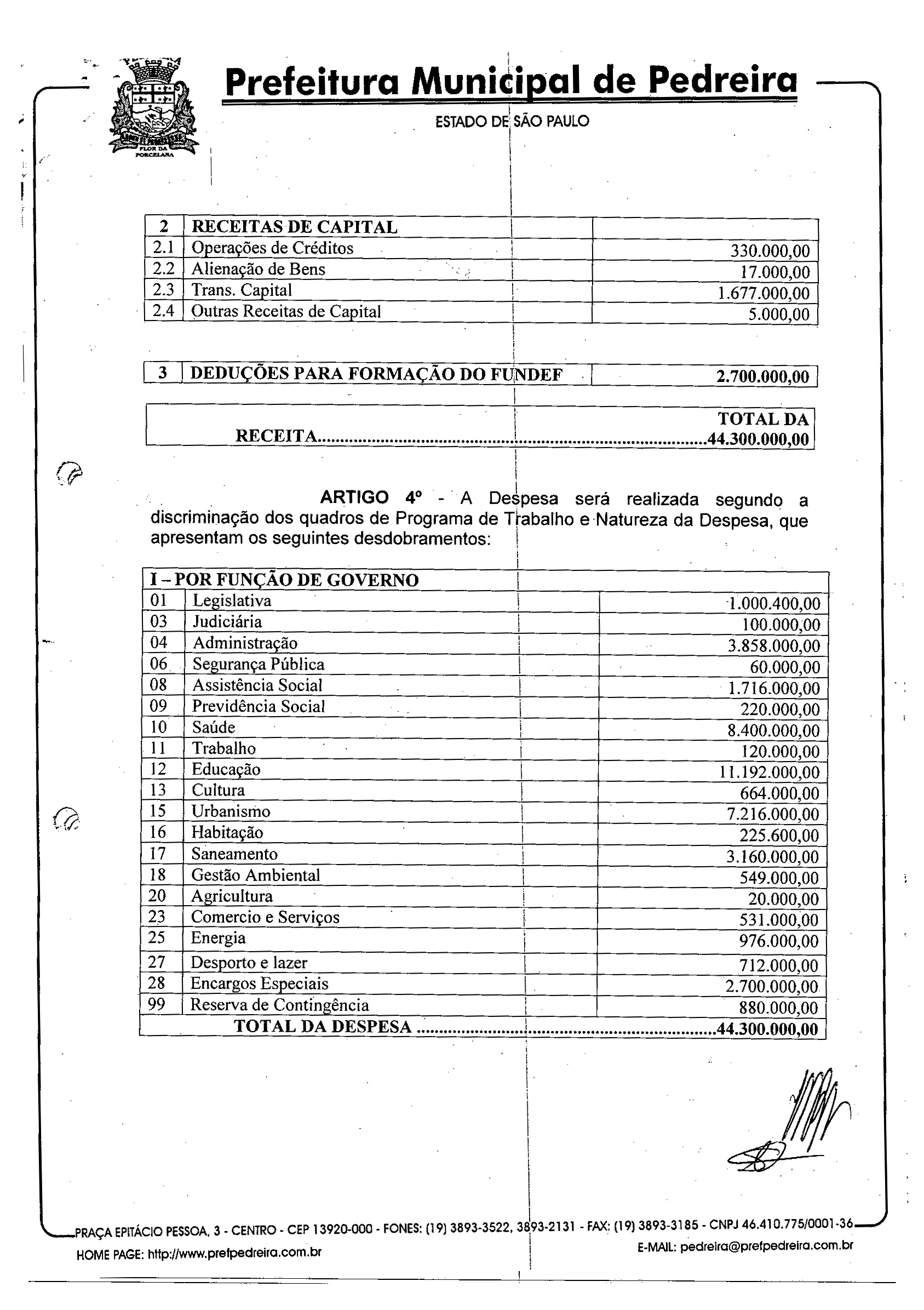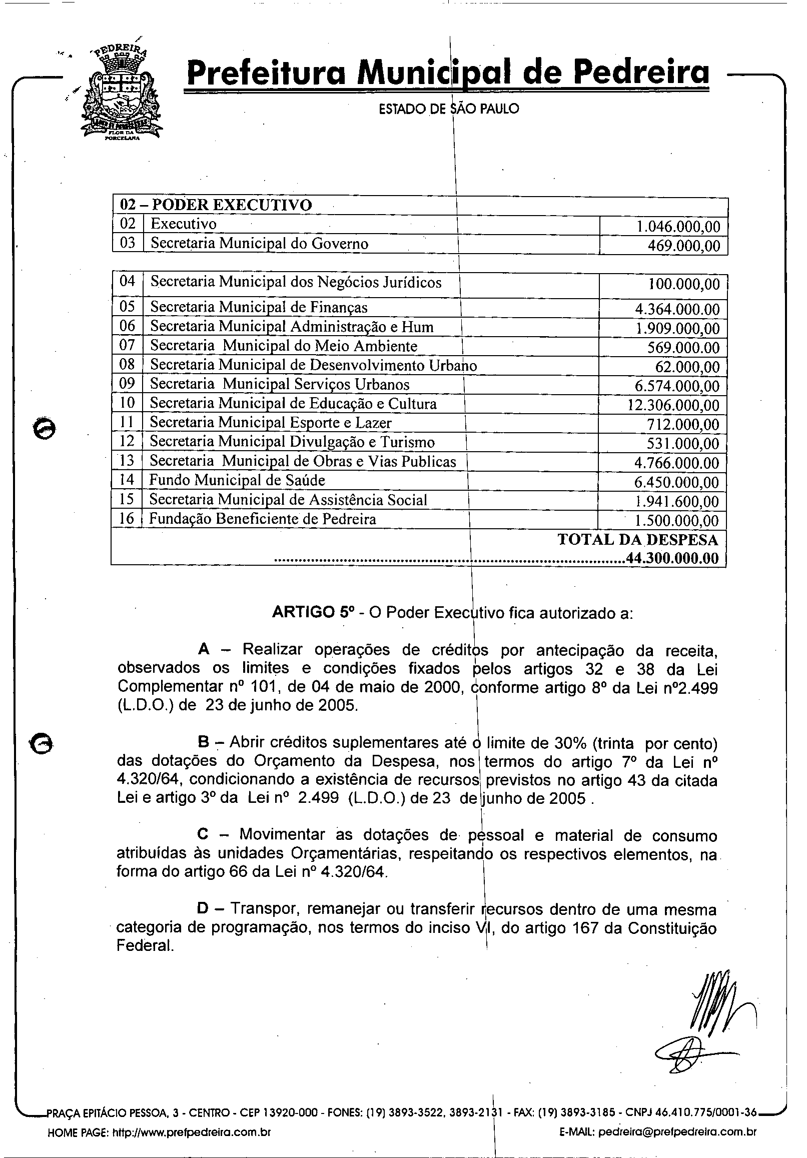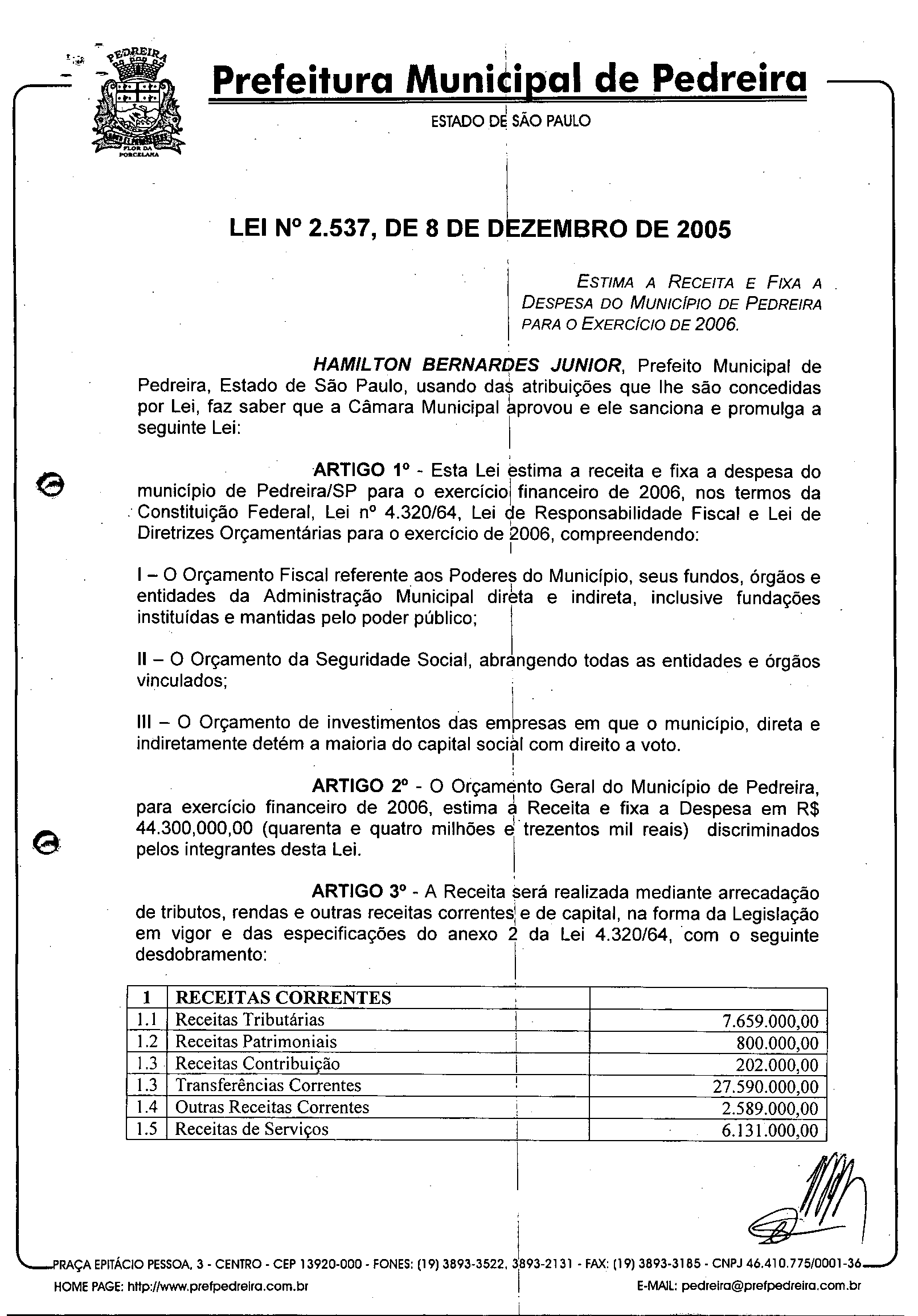 Ementa: Estima a Receita e Fixa a Despesa do Município de Pedreira para o Exercício de 2006.