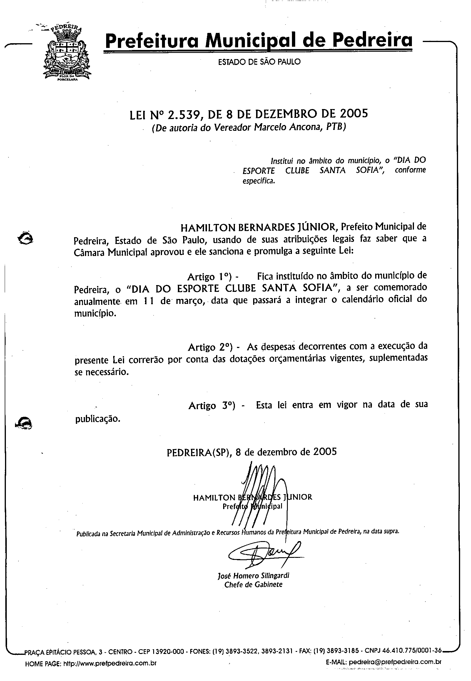 Lei Municipal - N° 2539 de 08/12/2005