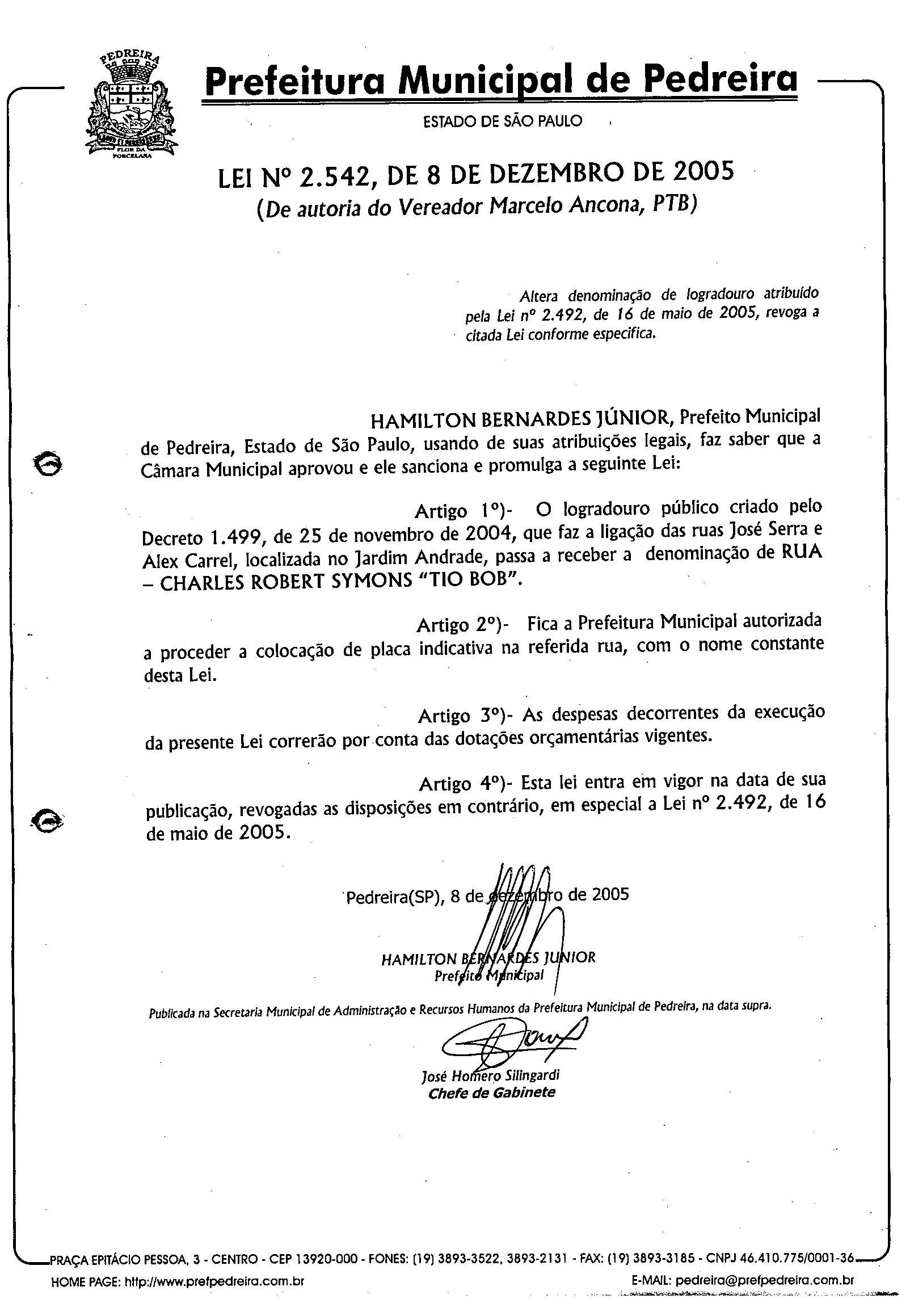 Lei Municipal - N° 2542 de 08/12/2005
