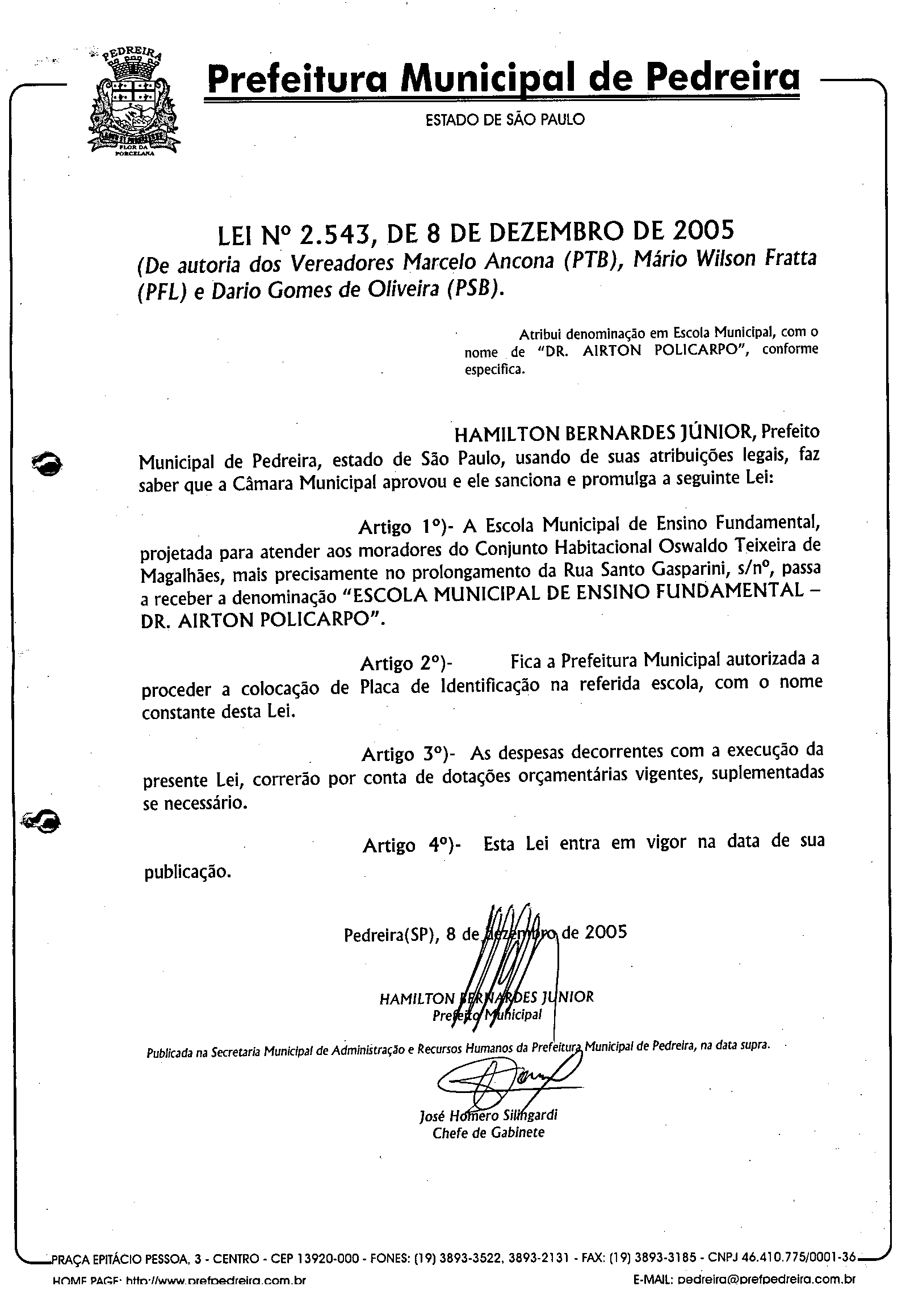 Ementa: Atribui denominação em Escola Municipal, com o nome de "DR. AÍRTON POLCARPO", conforme especifica.
