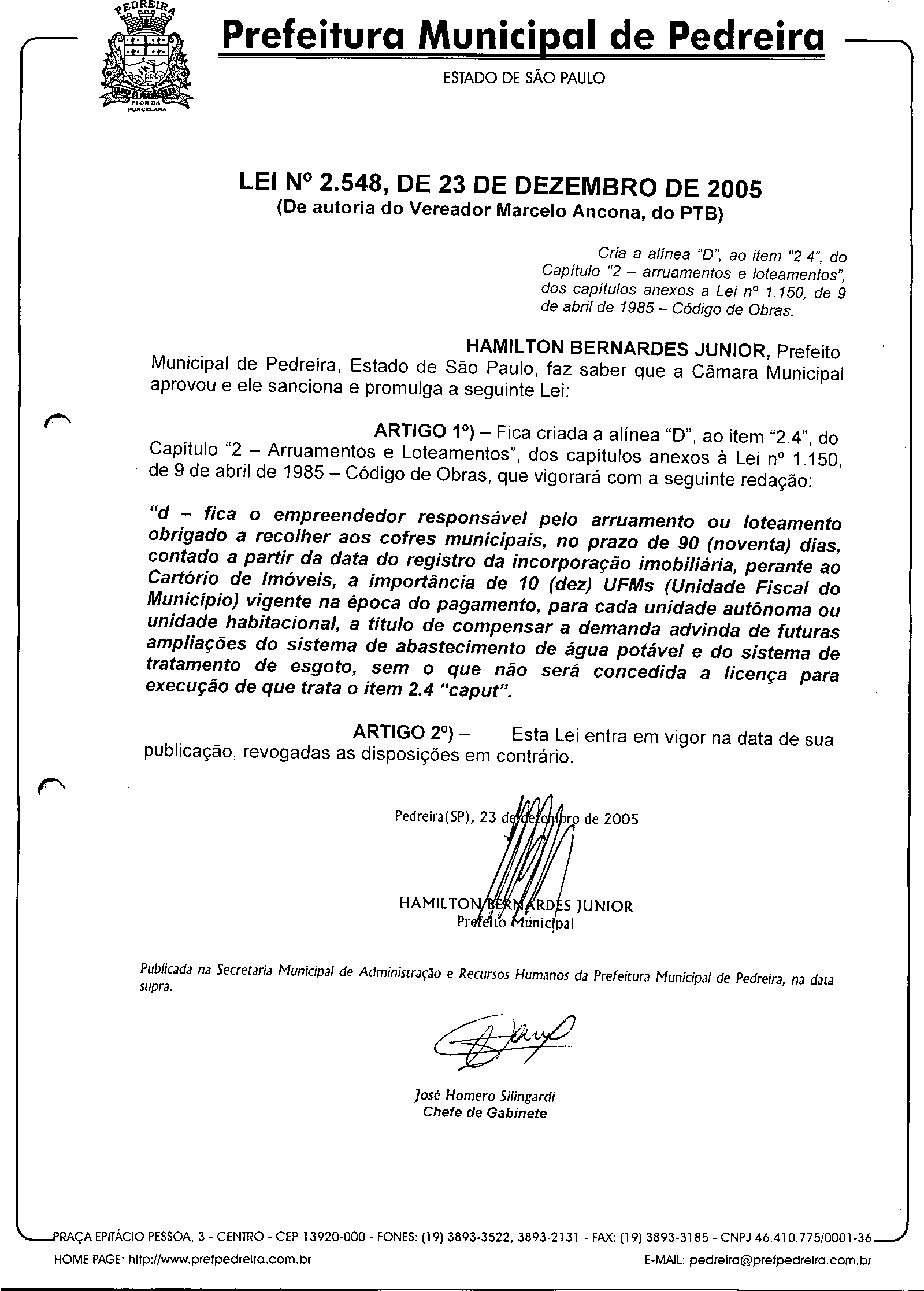 Ementa: Cria a alínea "D", ao item "2.4", do Capítulo "2 - armamentos e loteamentos", dos capítulos anexos a Lei n" 1.150, de 9 de abril de 1985 - Código de Obras.