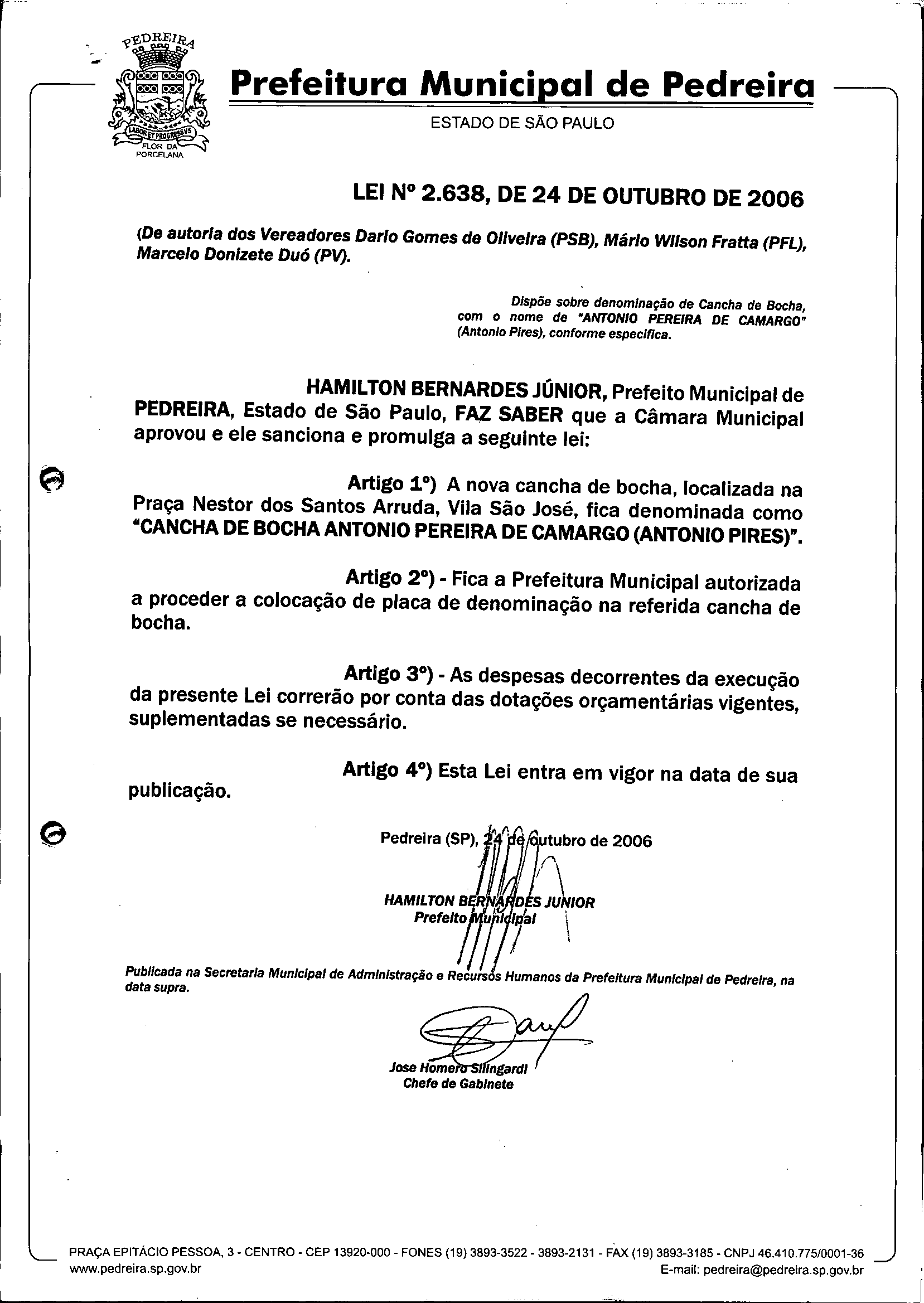 Ementa: Dispõe sobre denominação de Cancha de Bocha, com o nome de ANTÔNIO PEREIRA DE CAMARGO" (Antônio Pires), conforme específica.