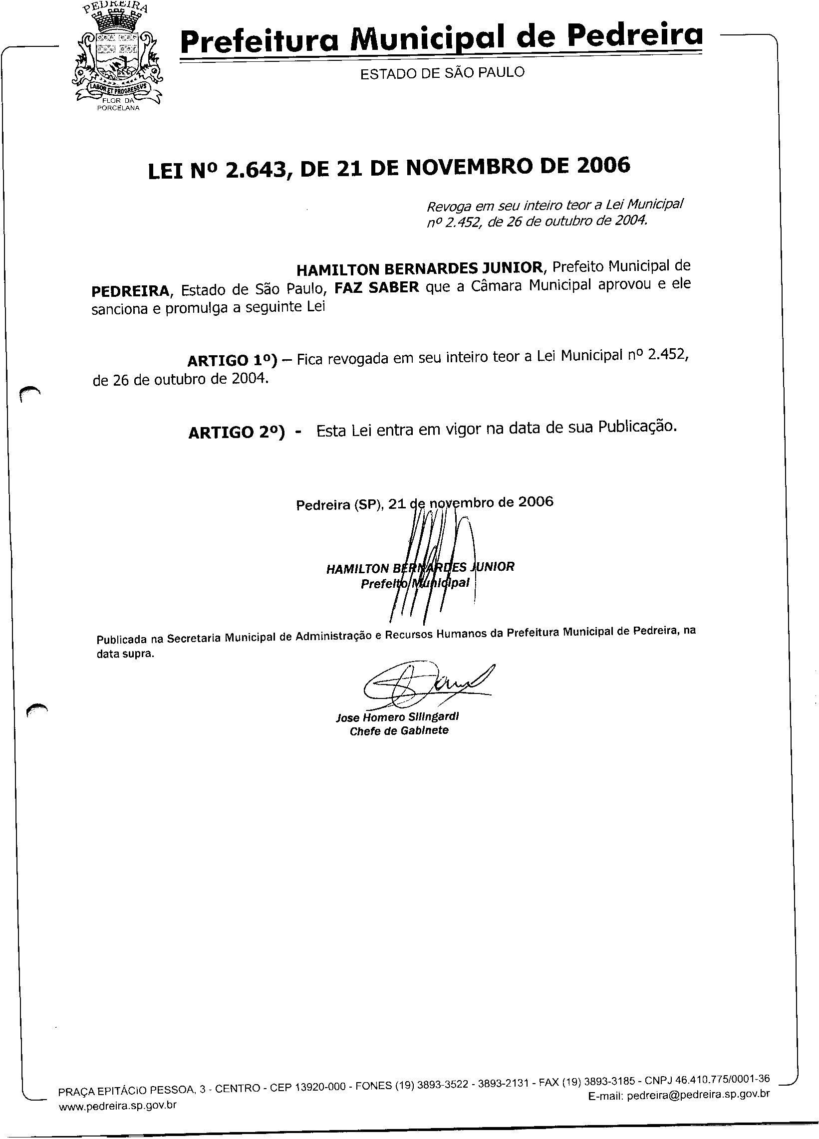 Ementa: Revoga em seu inteiro teor a Lei Municipal n° 2.452, de 26 de outubro de 2004.