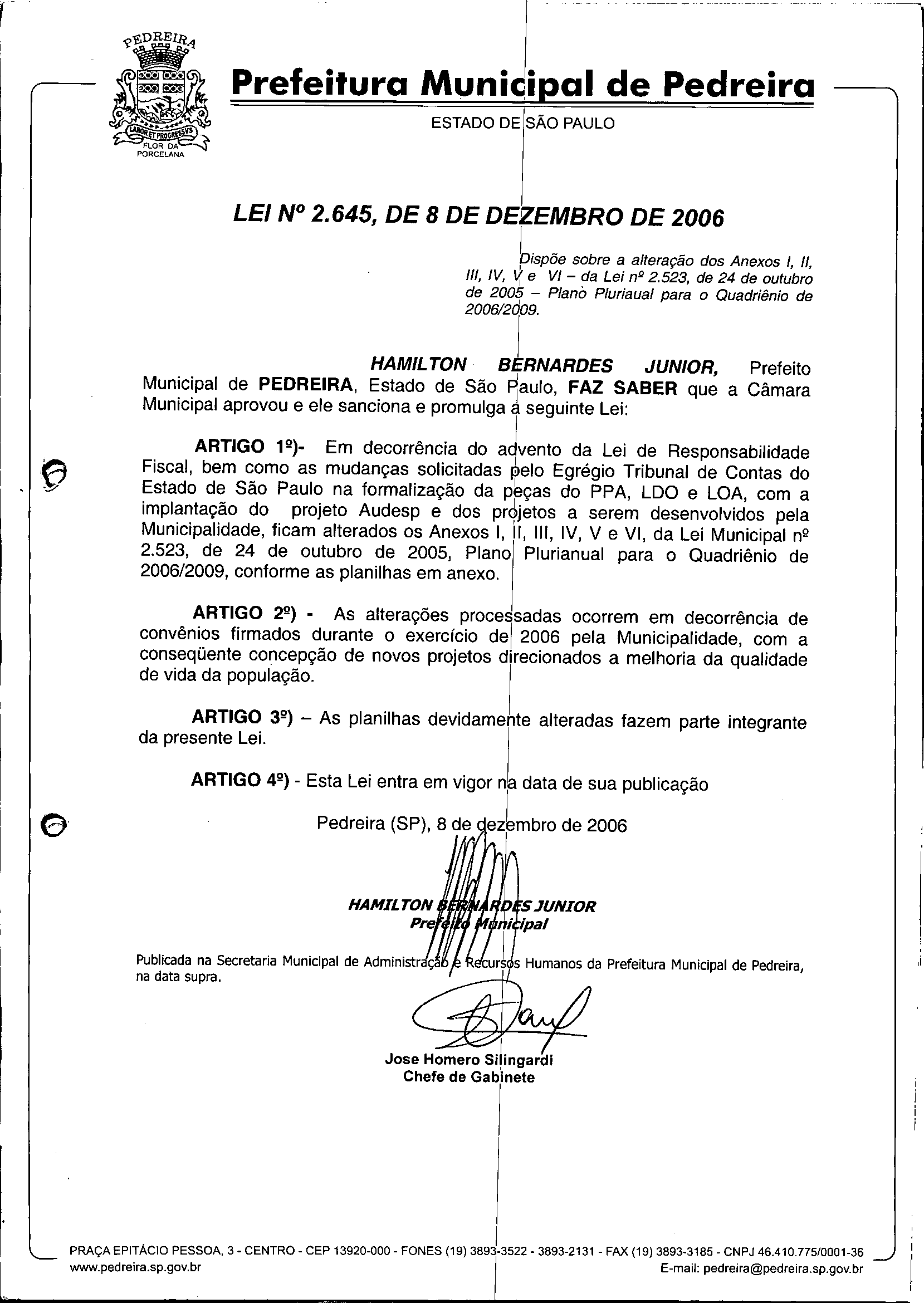 Ementa: Dispõe sobre a alteração dos Anexos I, II, III, IV, Vte VI-da Lei nº 2.523, de 24 de outubro de 2005 - Plano Pluriaual para o Quadriênio de 2006/2009.