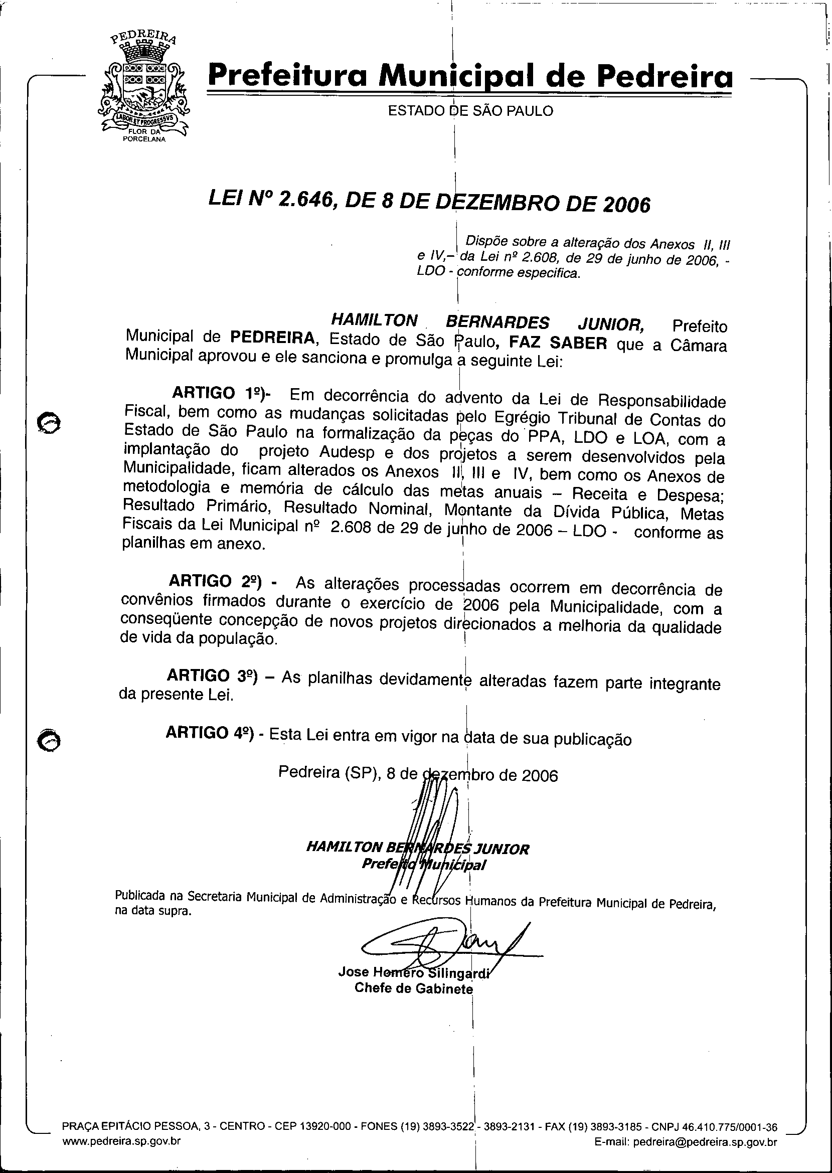 Lei Municipal - N° 2646 de 08/12/2006
