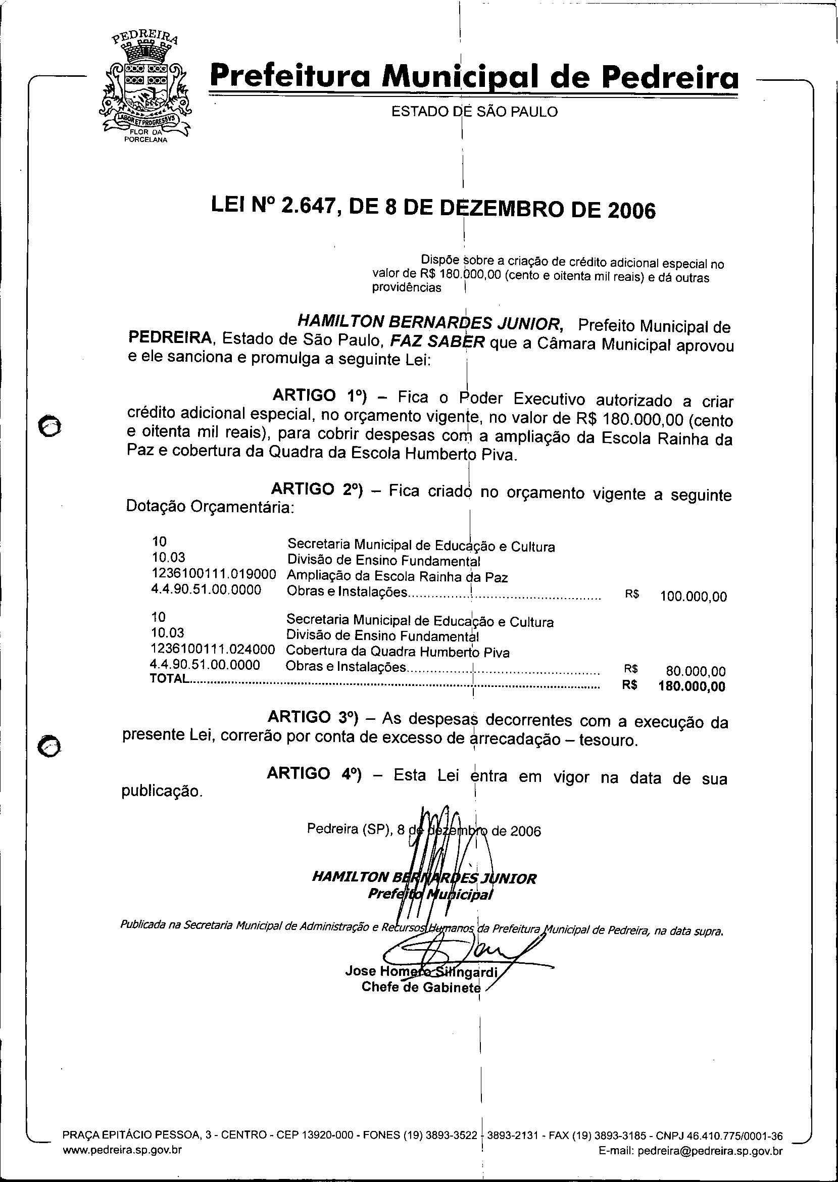 Ementa: Dispõe sobre a criação de crédito adicional especial no valor de R$ 180.000,00 (cento e oitenta mil reais) e dá outras providências
