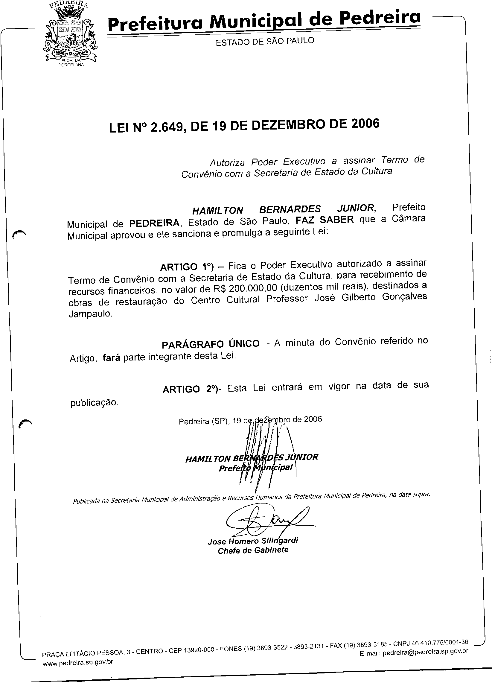 Lei Municipal - N° 2649 de 19/12/2006