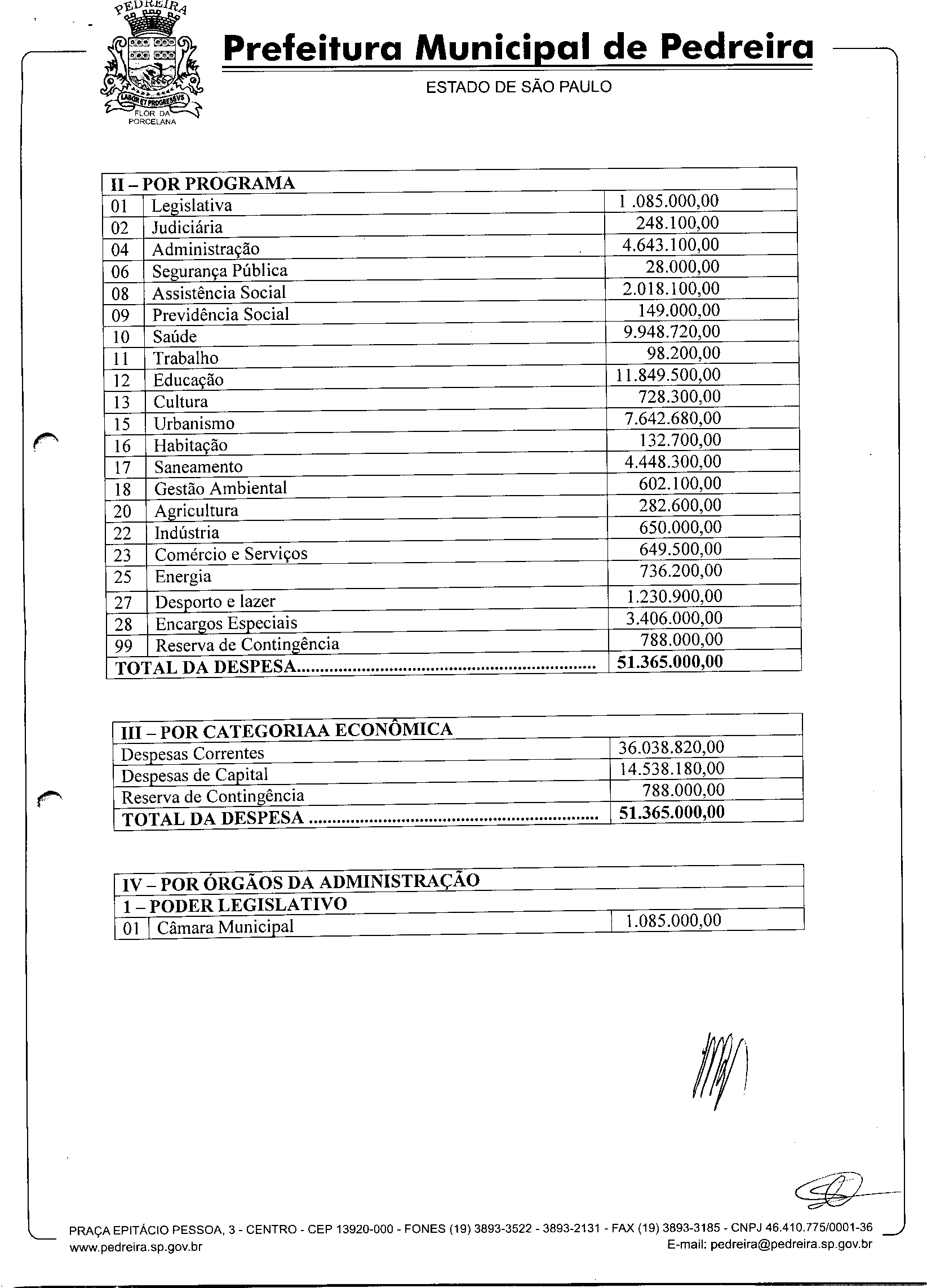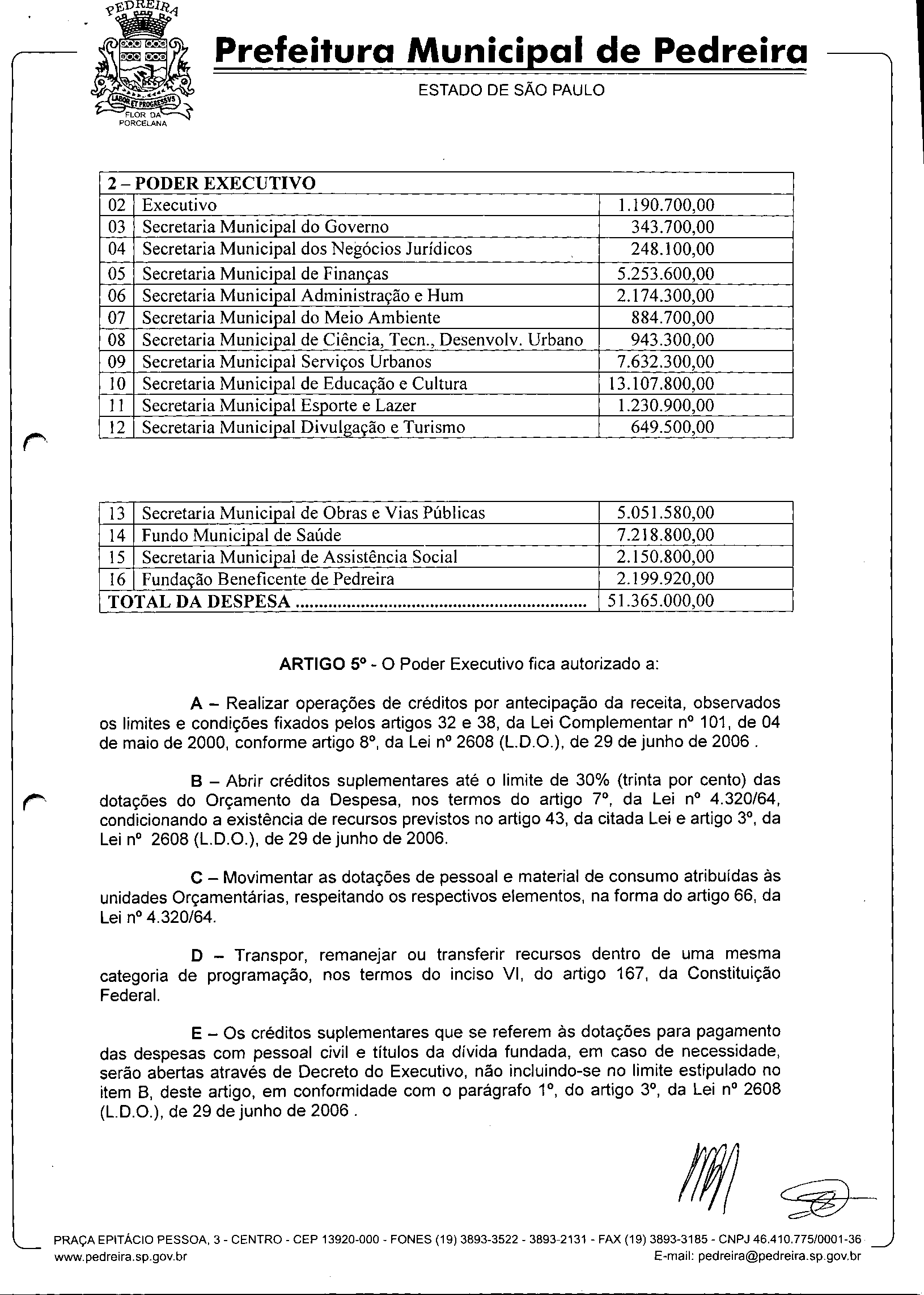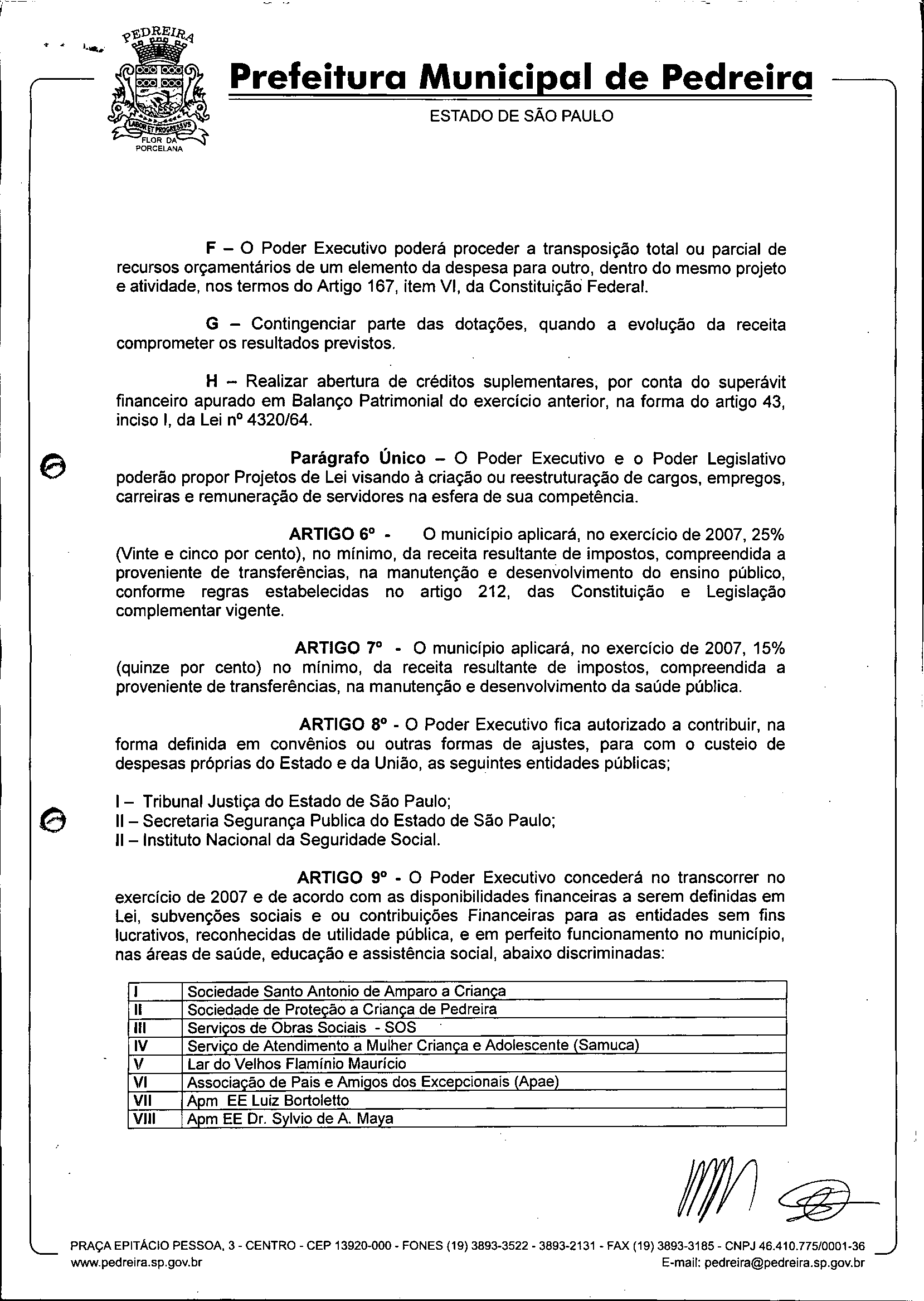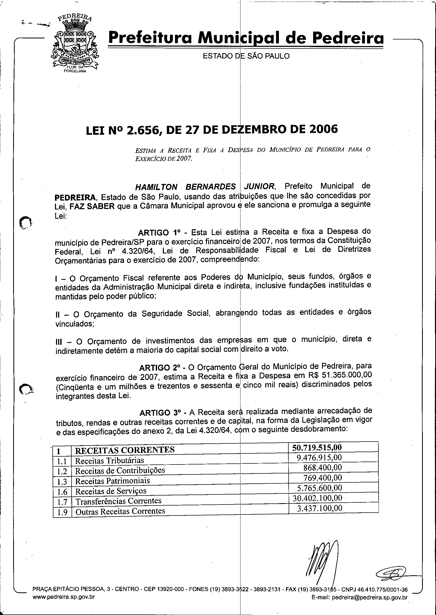 Ementa: Estima a Receita e Fixa a Despesa do Município de Pedreira para o Exercício de 2007.