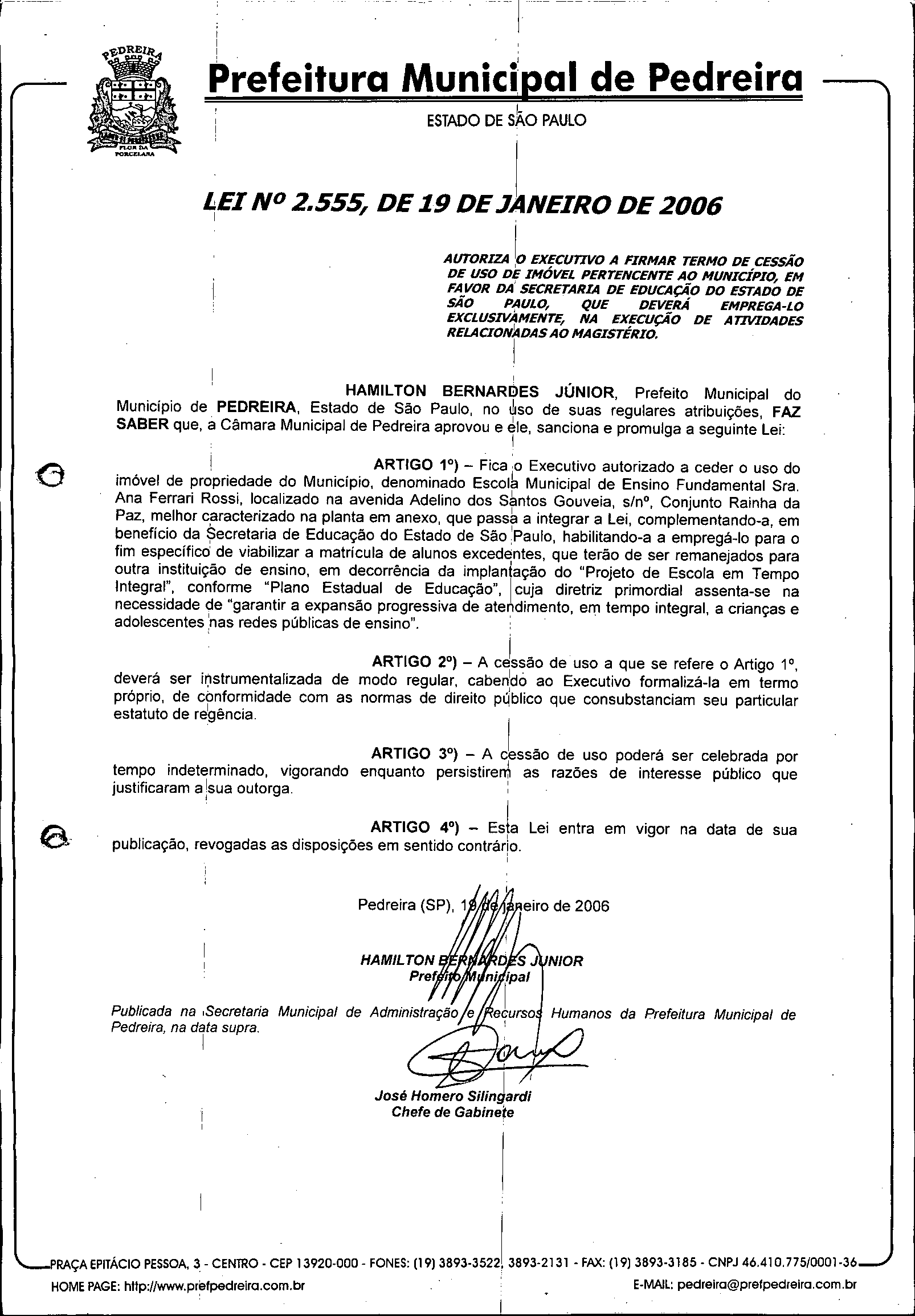 Lei Municipal - N° 2555 de 19/01/2005