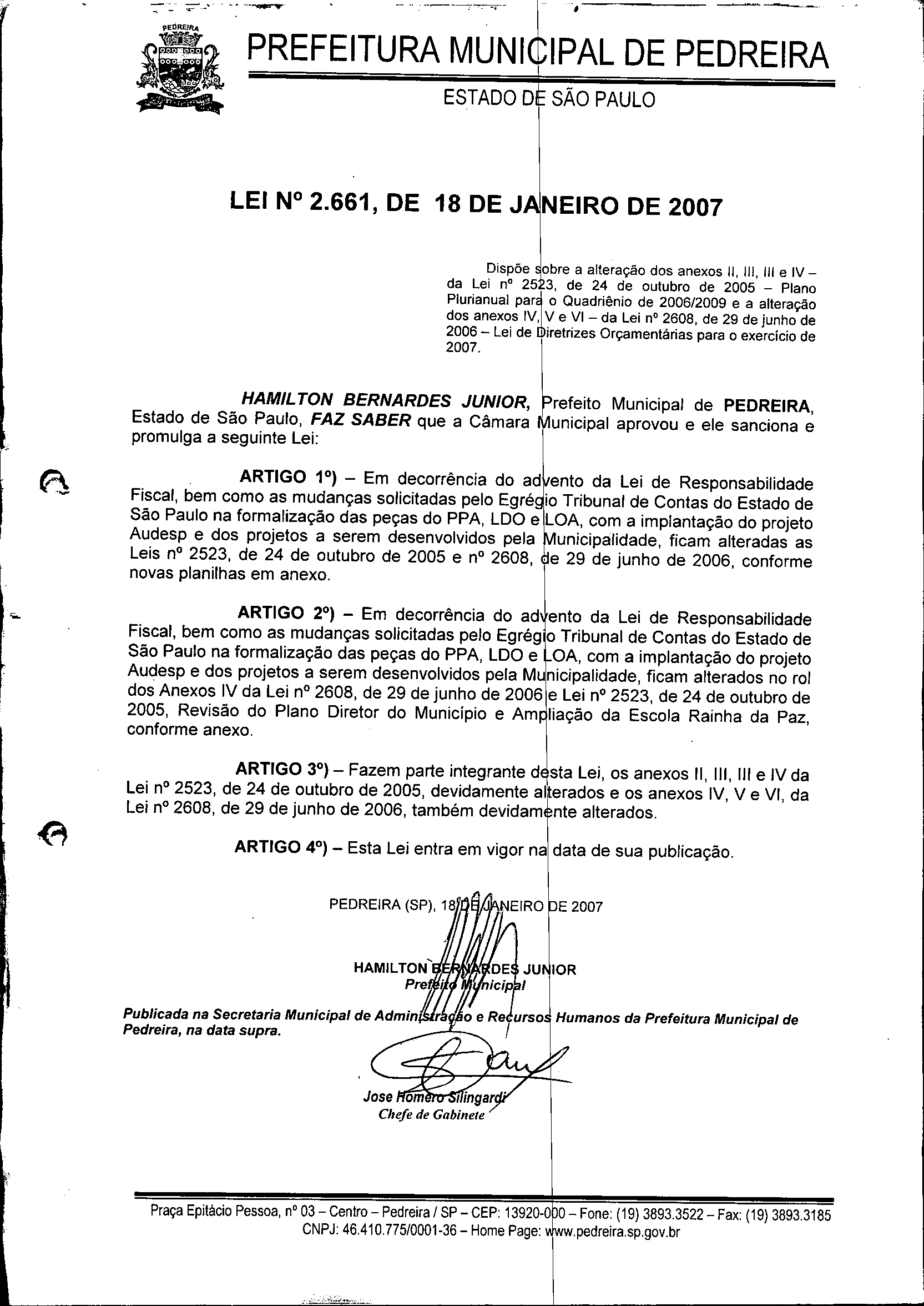 Ementa: Dispõe sobre a alteração dos anexos II, lll, III e IV -da Lei n° 2523, de 24 de outubro de 2005 - Plano Plurianual para o Quadriênio de 2006/2009 e a alteração dos anexos IV, V e VI - da Lei n° 260S, de 29 de junho de 2006 - Lei de Diretrizes Orçamentárias