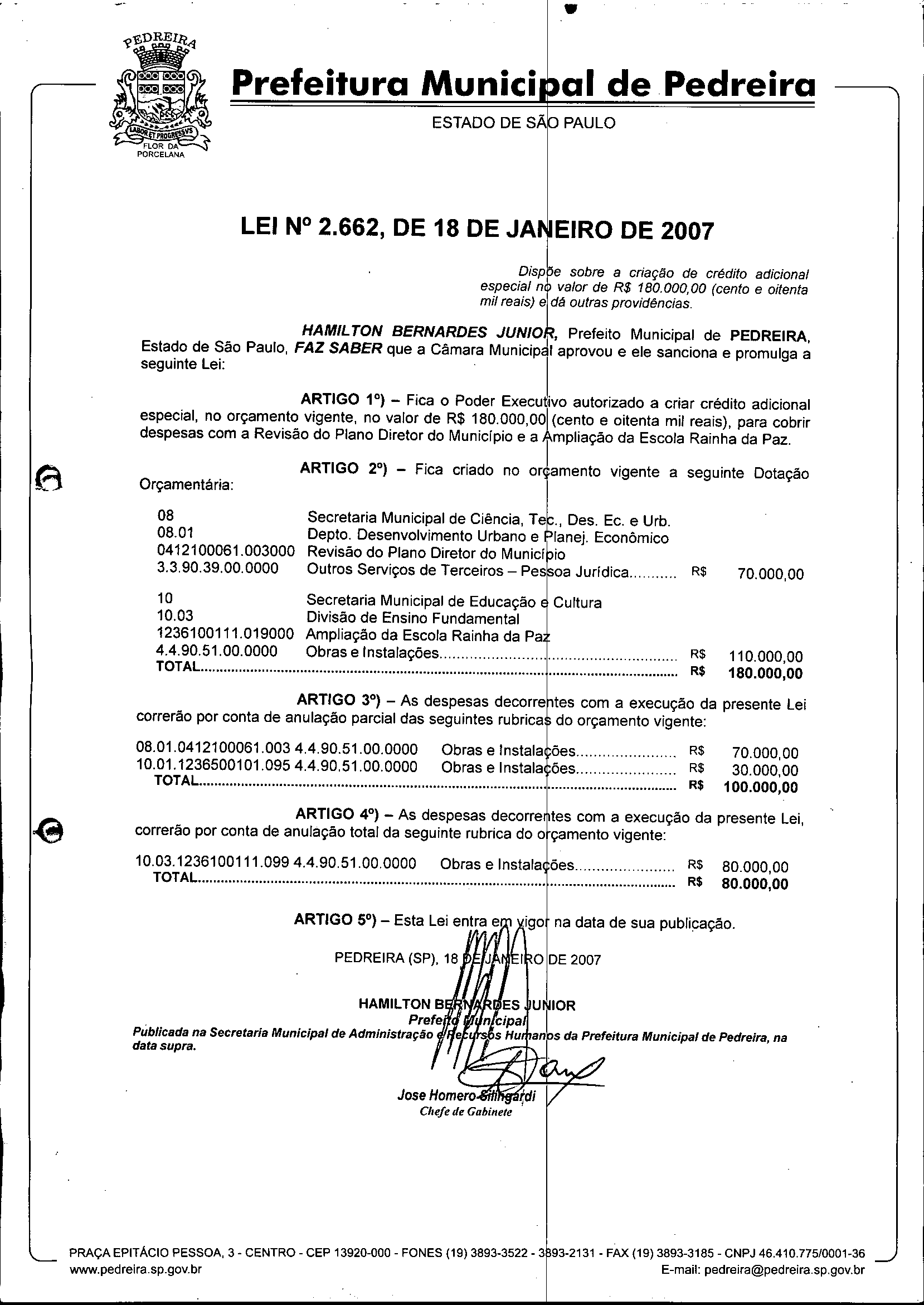 Lei Municipal - N° 2662 de 18/01/2007