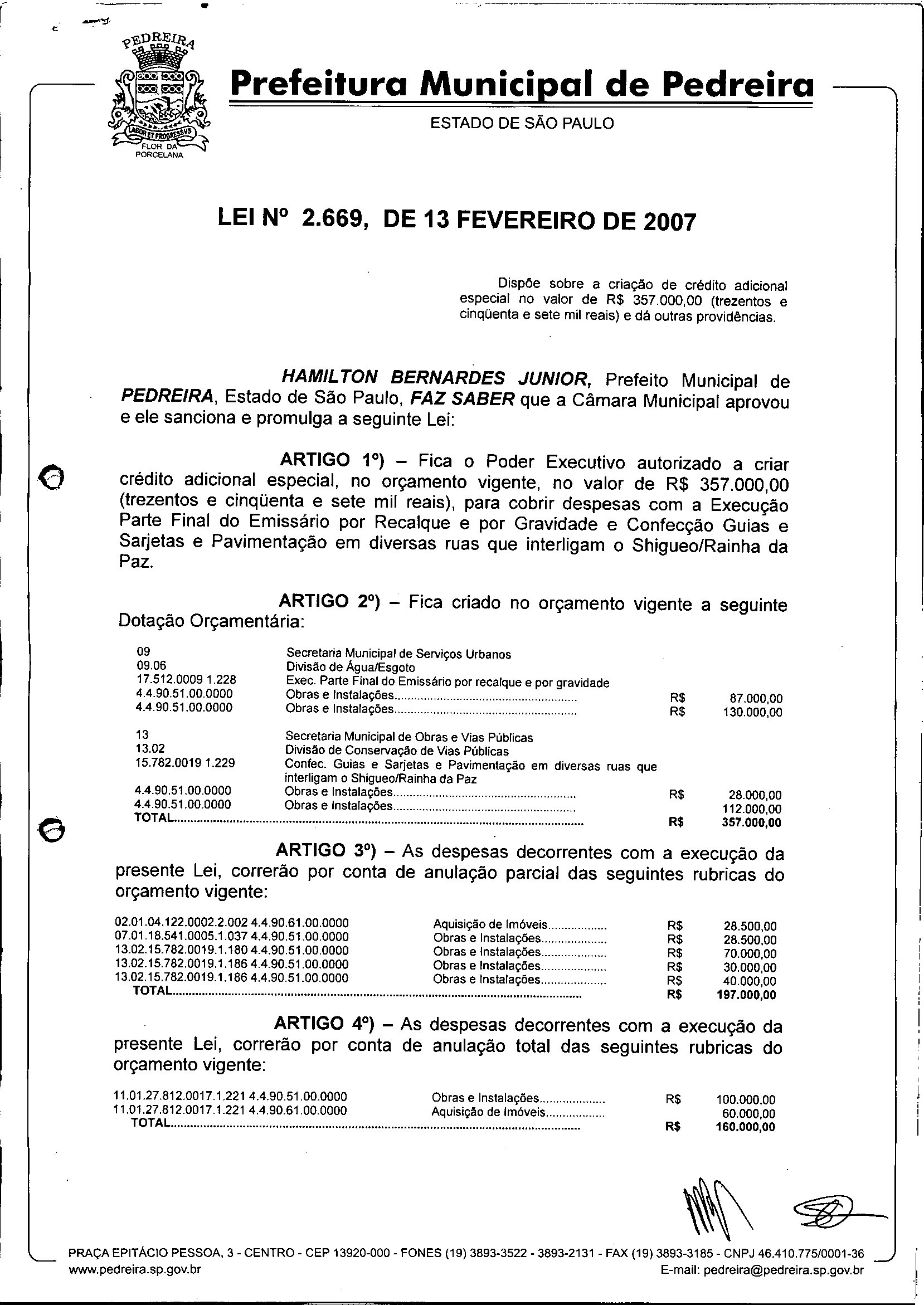 Ementa: Dispõe sobre a criação de crédito adicional especial no valor de R$ 357.000,00 (trezentos e cinqüenta e sete mil reais) e dá outras providências.