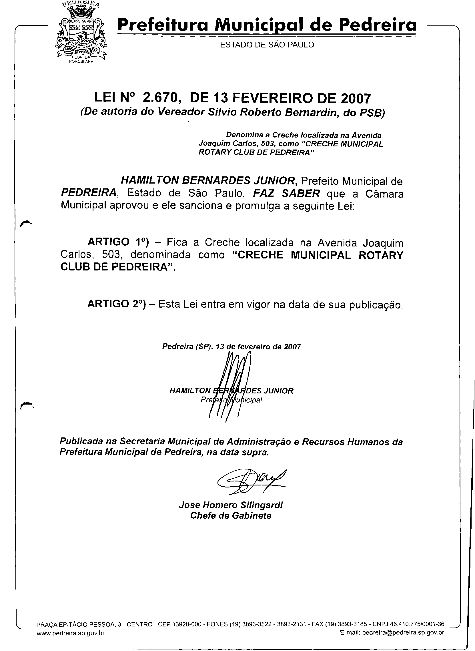 Ementa: Denomina a Creche localizada na Avenida Joaquim Carlos, 503, como "CRECHE MUNICIPAL ROTARY CLUB DE PEDREIRA"