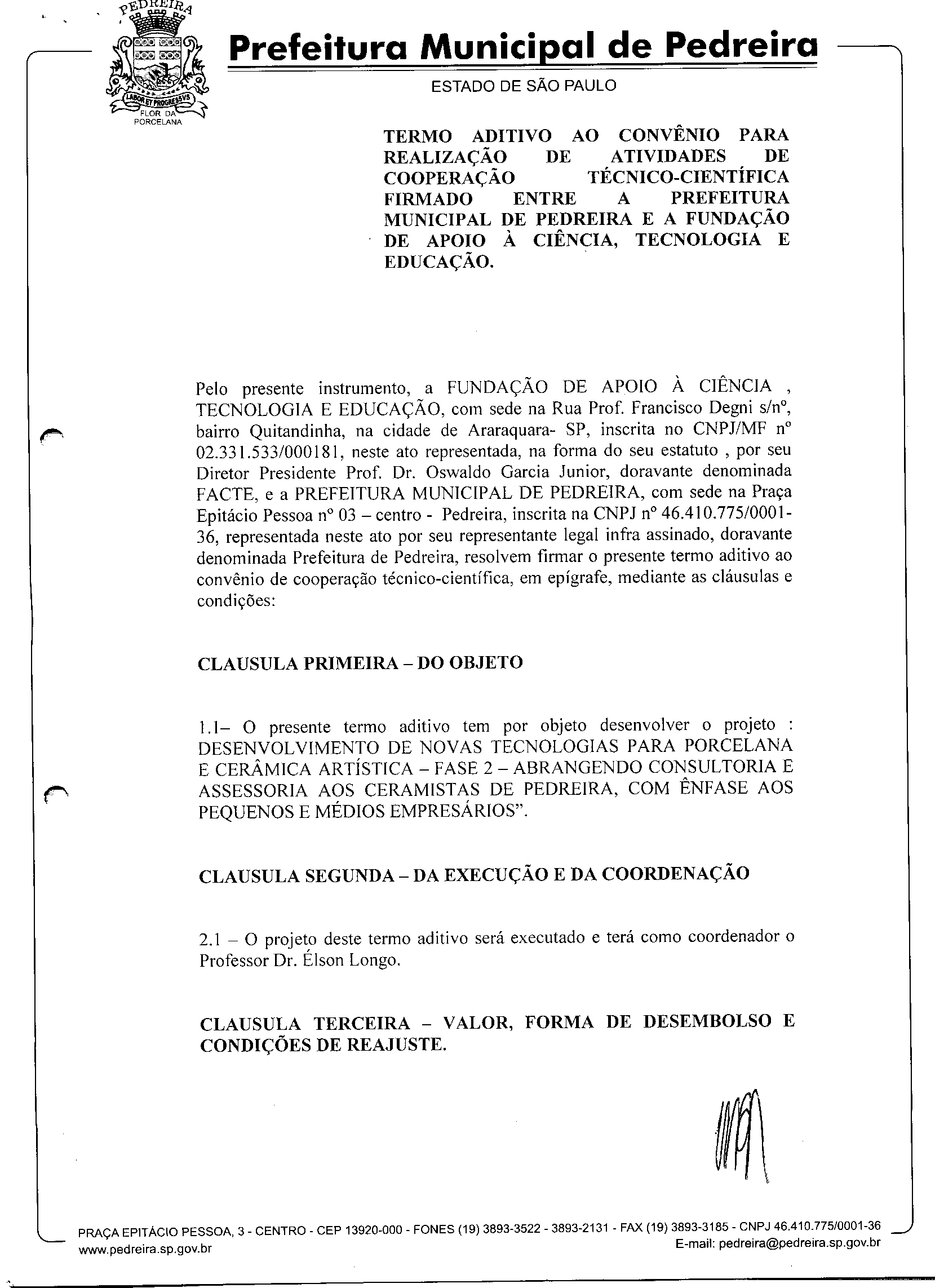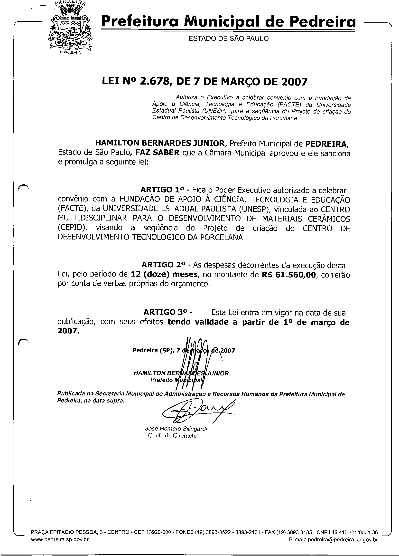 Ementa: Autoriza o Executivo a celebrar convênio com a Fundação de Apoio à Ciência, Tecnologia e Educação (FACTE) da Universidade Estadual Paulista (UNESP), para a seqüência do Projeto de criação do Centro de Desenvolvimento Tecnológico da Porcelana.