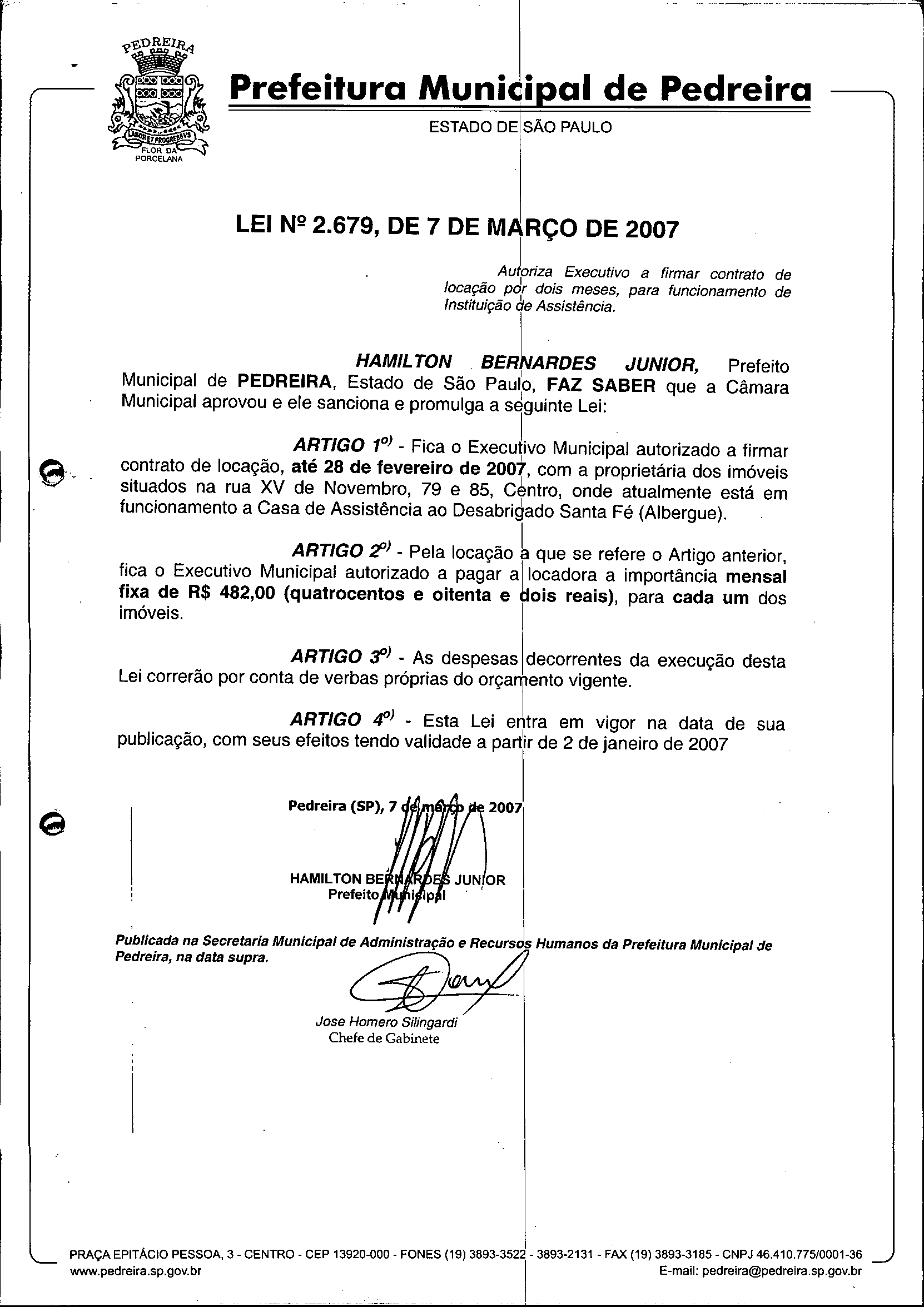 Lei Municipal - N° 2679 de 07/03/2007