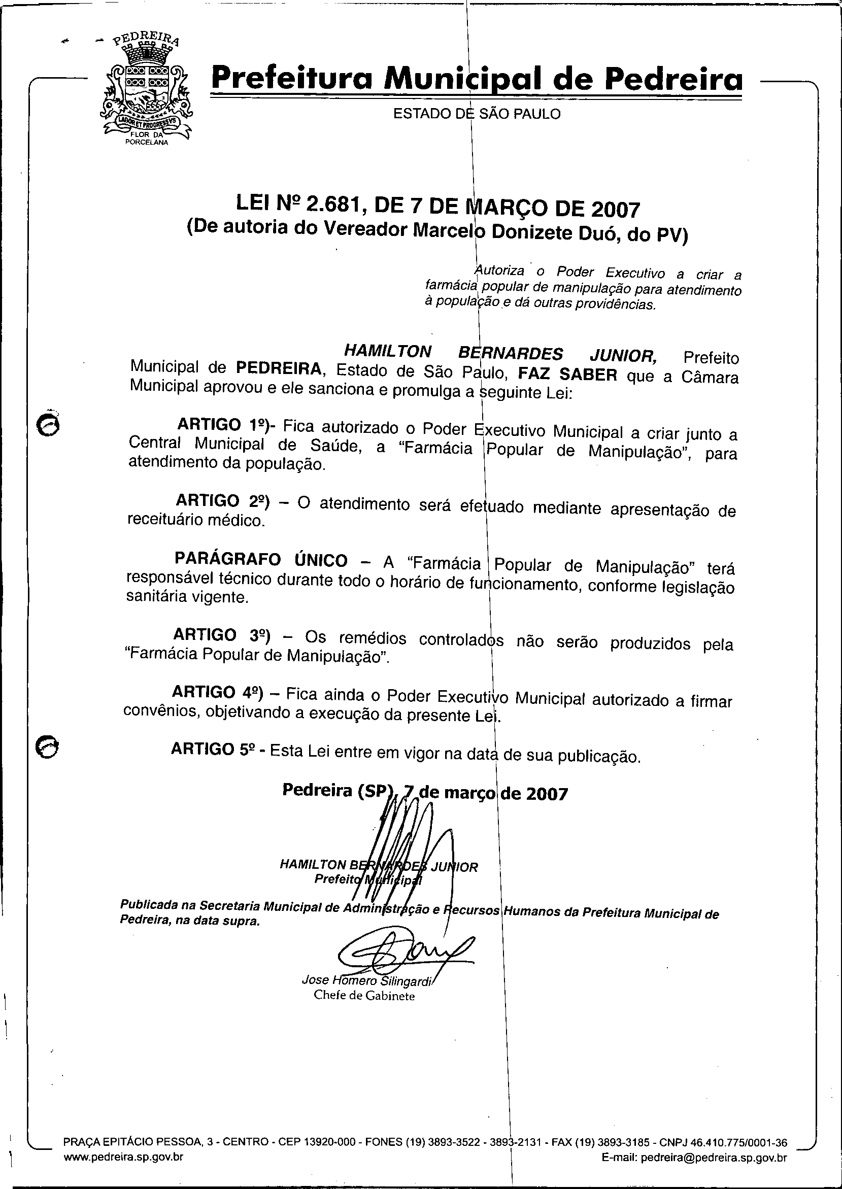 Lei Municipal - N° 2681 de 07/03/2007