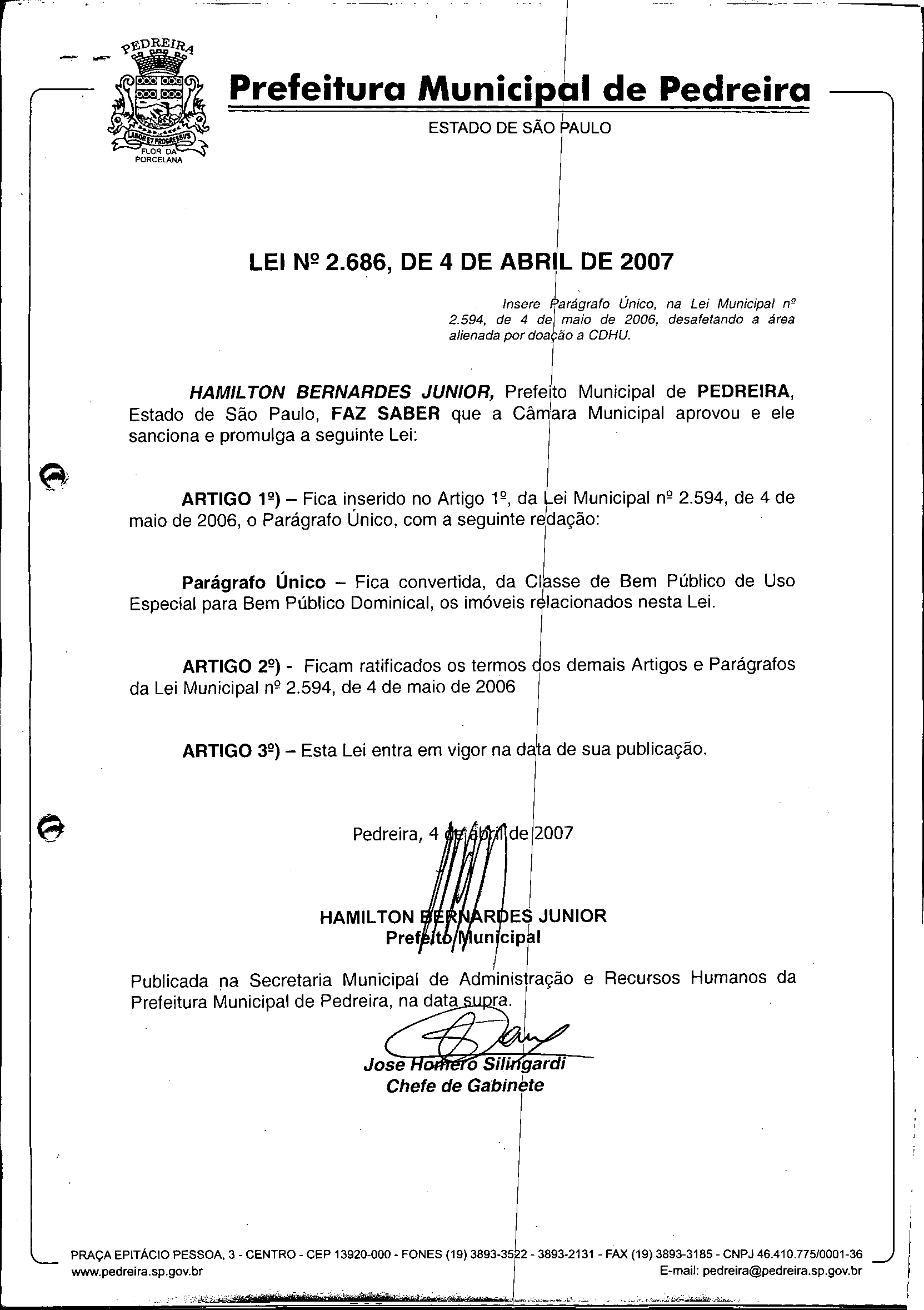 Lei Municipal - N° 2686 de 04/04/2007