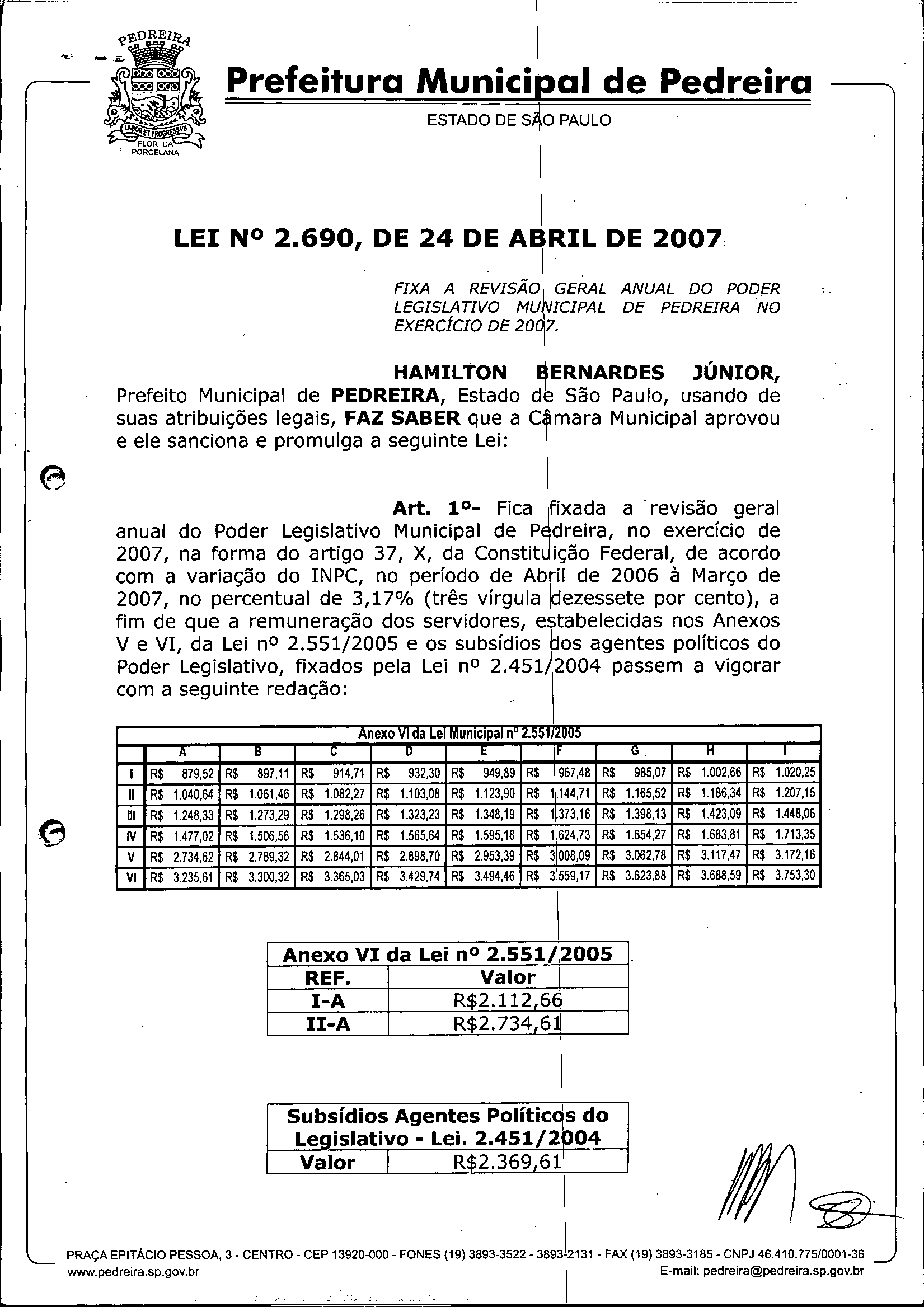 Ementa: FIXA A REVISÃO GERAL ANUAL DO PODER LEGISLATIVO MUNICIPAL DE PEDREIRA NO EXERCÍCIO DE 2007.