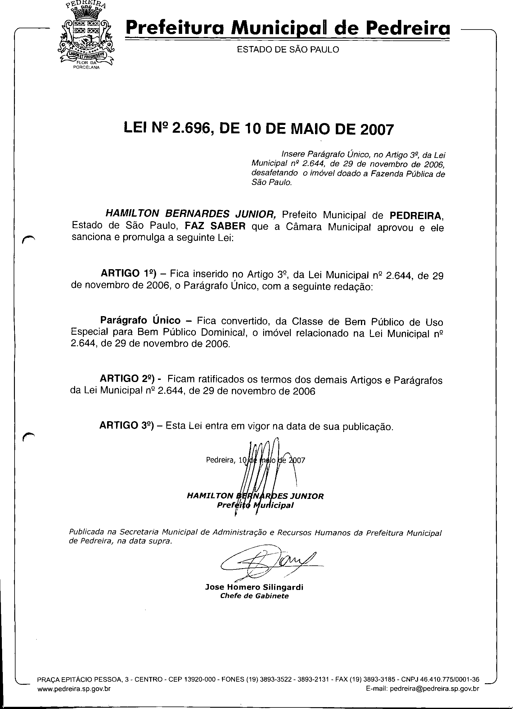 Ementa: Insere Parágrafo Único, no Artigo 3° da Lei Municipal nº 2.644, de 29 de novembro de 2006, desafetando o imóvel doado a Fazenda Pública de São Paulo.