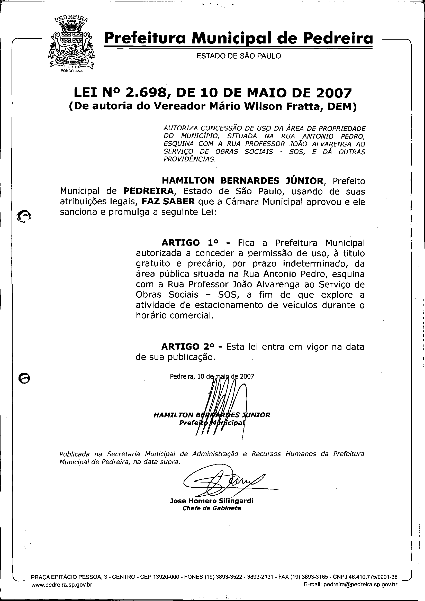 Lei Municipal - N° 2698 de 10/05/2007