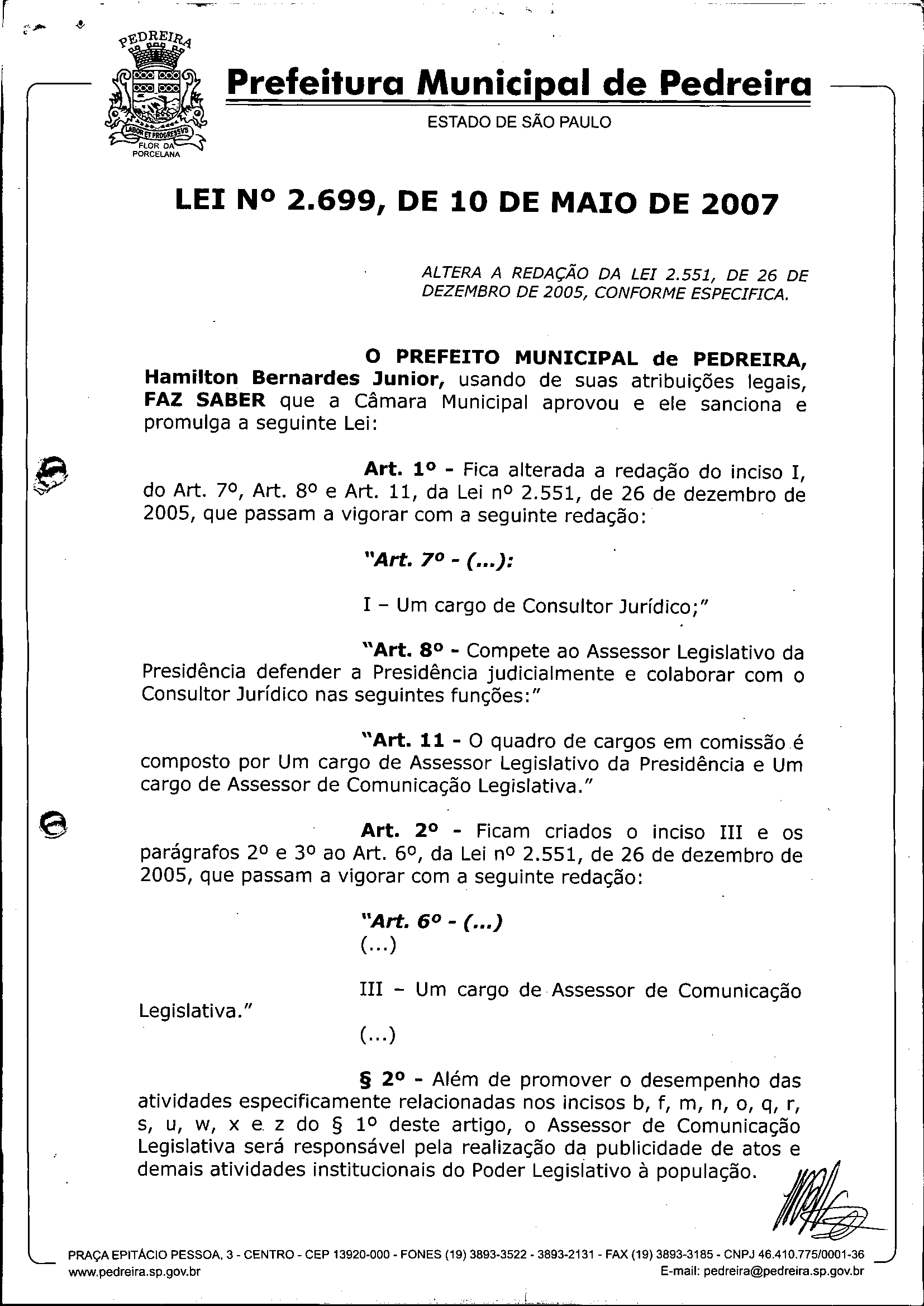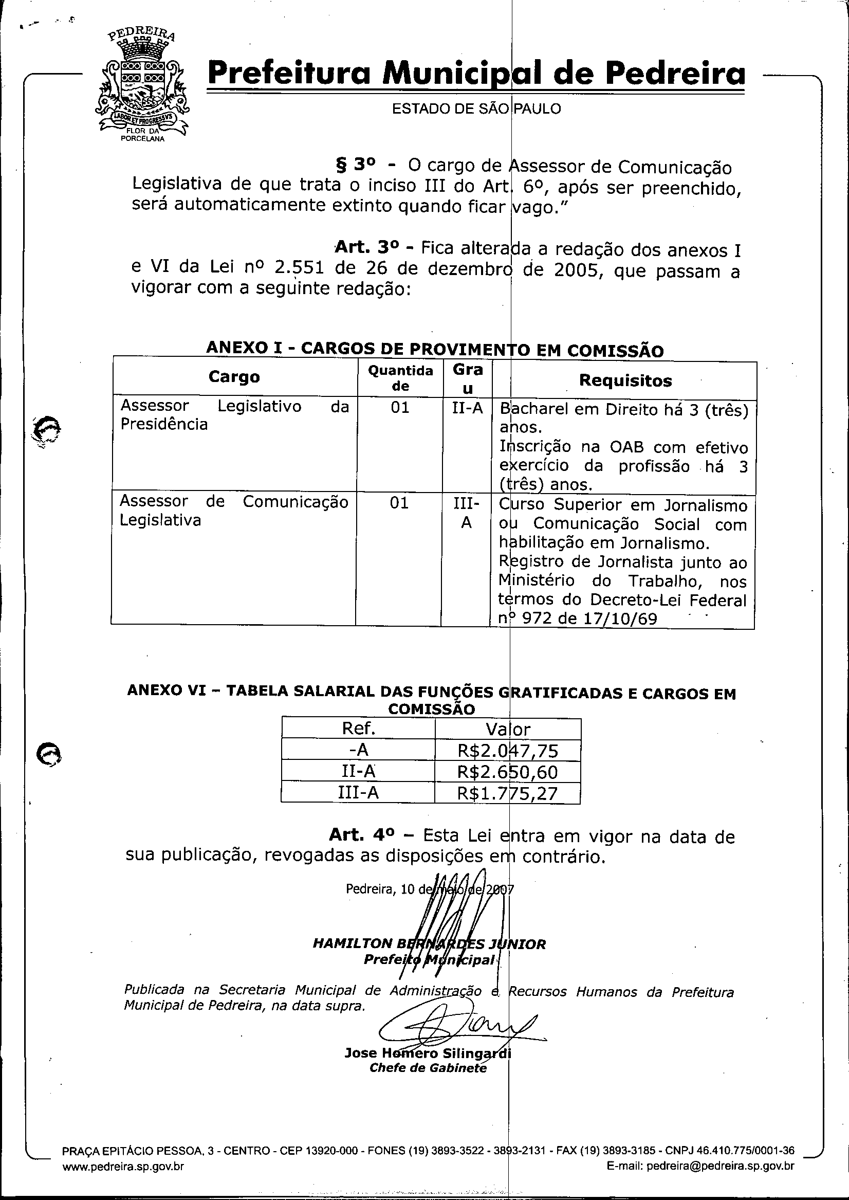 Ementa: ALTERA A REDAÇÃO DA LEI 2.551, DE 26 DE DEZEMBRO DE 2005, CONFORME ESPECIFICA.