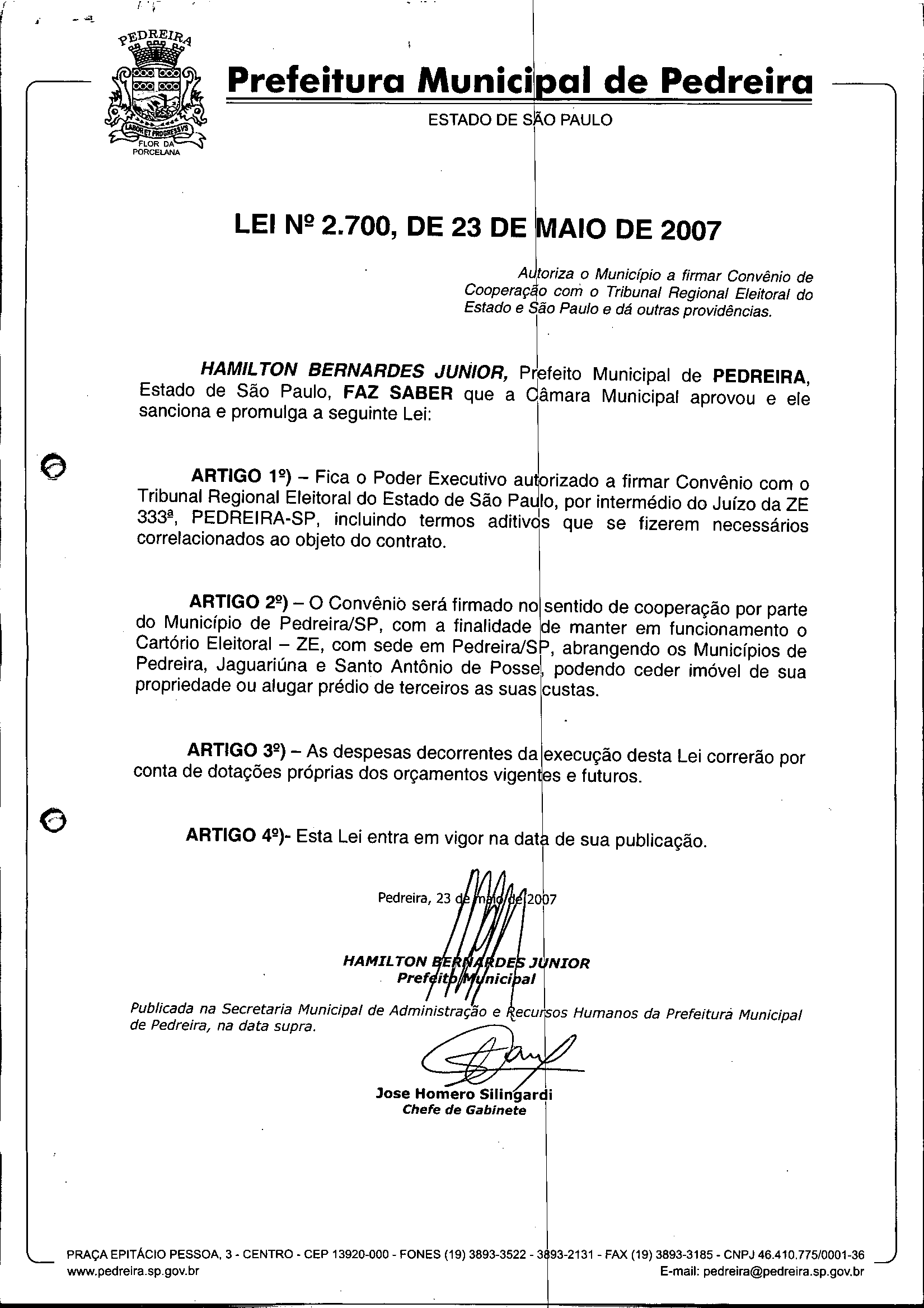 Lei Municipal - N° 2700 de 23/05/2007