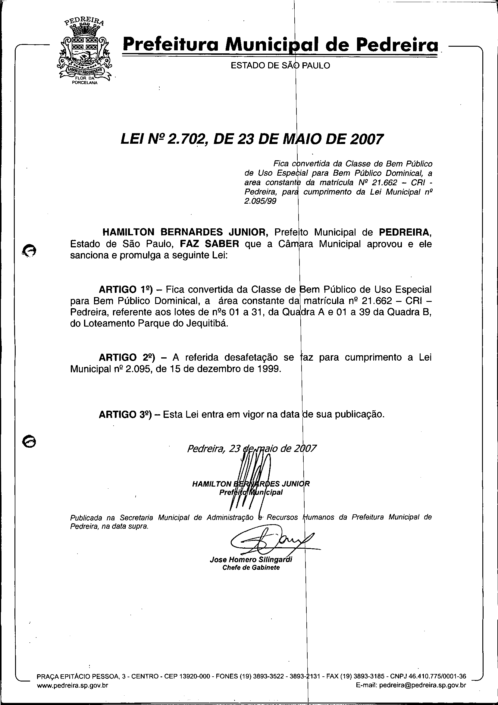 Ementa: Fica convertida da Classe de Bem Público de Uso Especial para Bem Público Dominical, a área constante da matrícula Nº21.662 - CRI -Pedreira, para cumprimento da Lei Municipal nº 2.095/99.