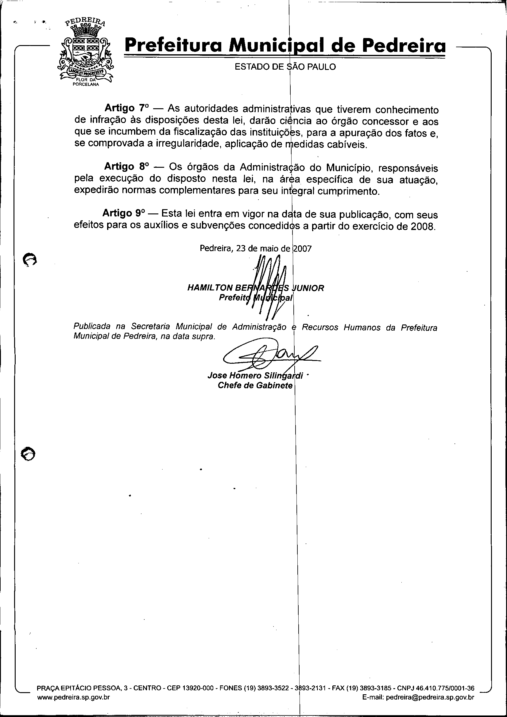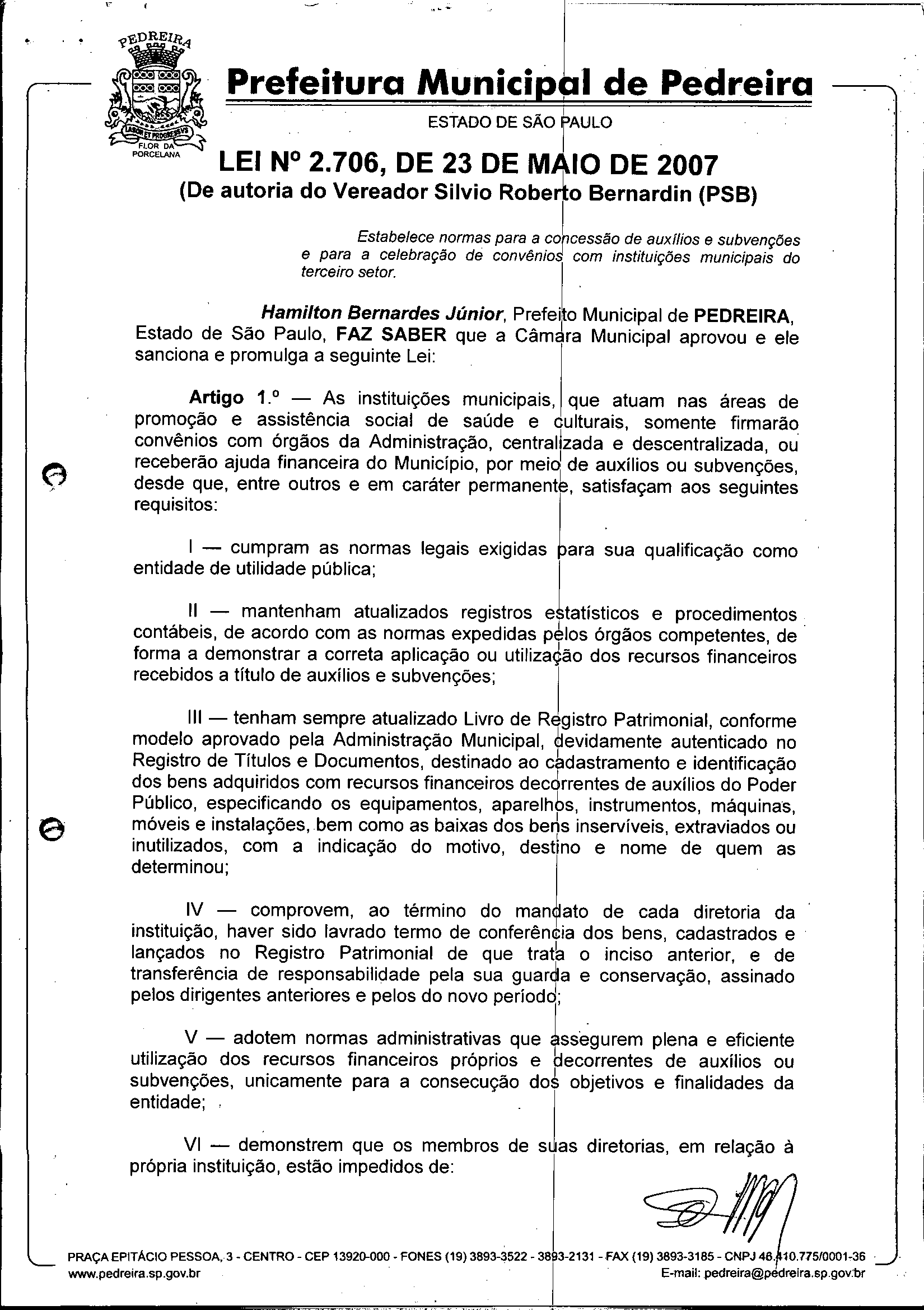 Lei Municipal - N° 2706 de 23/05/2007
