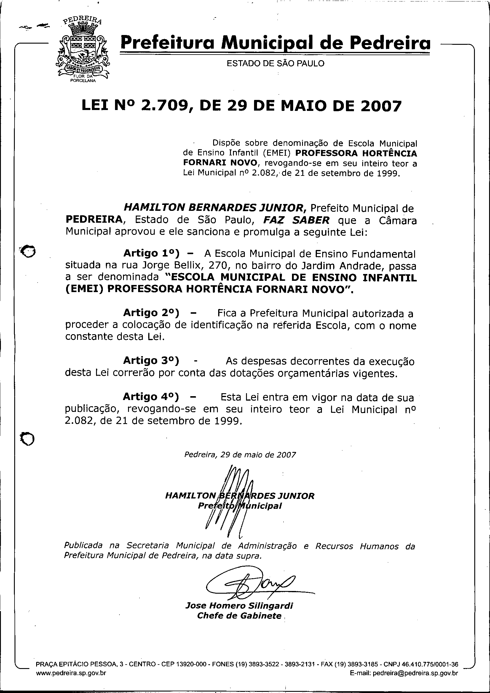 Ementa: Dispõe sobre denominação de Escola Municipal de Ensino Infantil (EMEI) PROFESSORA HORTÊNCIA FORNARI NOVO, revogando-se em seu inteiro teor a Lei Municipal n° 2.082/de 21 de setembro de 1999.