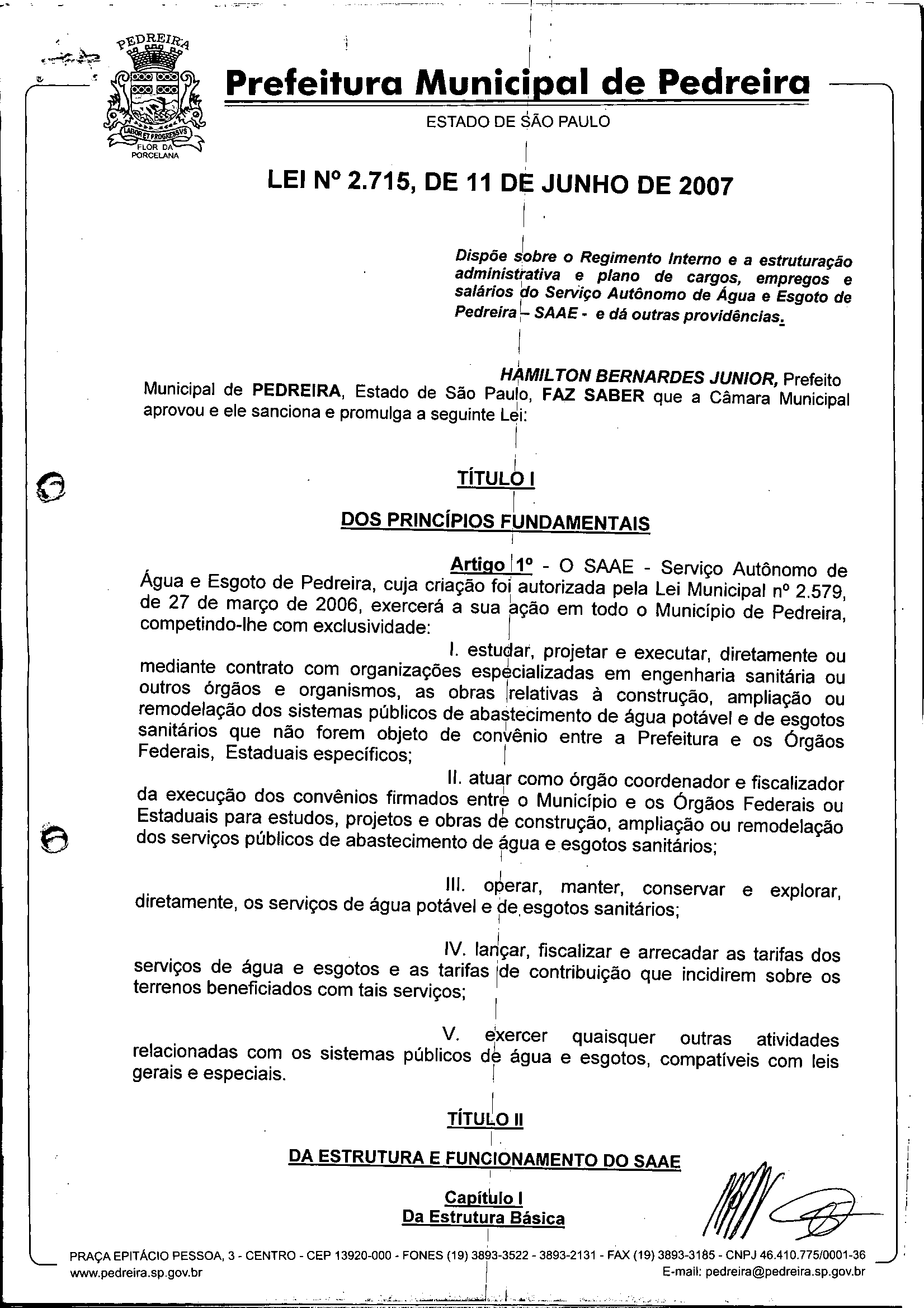 Lei Municipal - N° 2715 de 11/06/2007