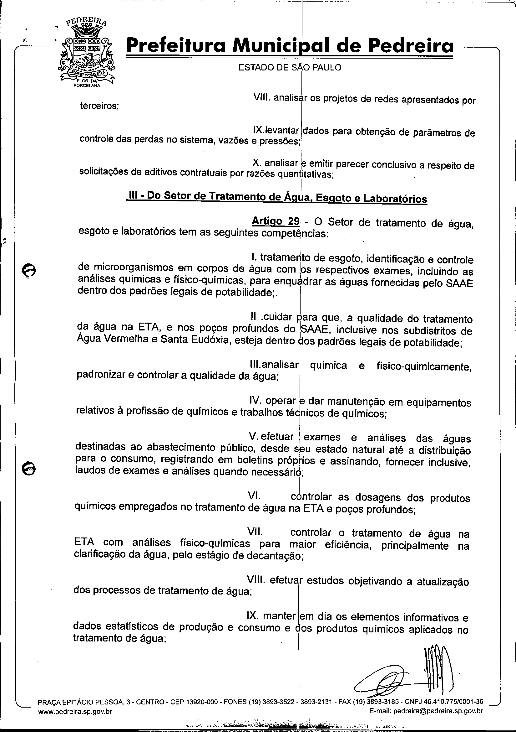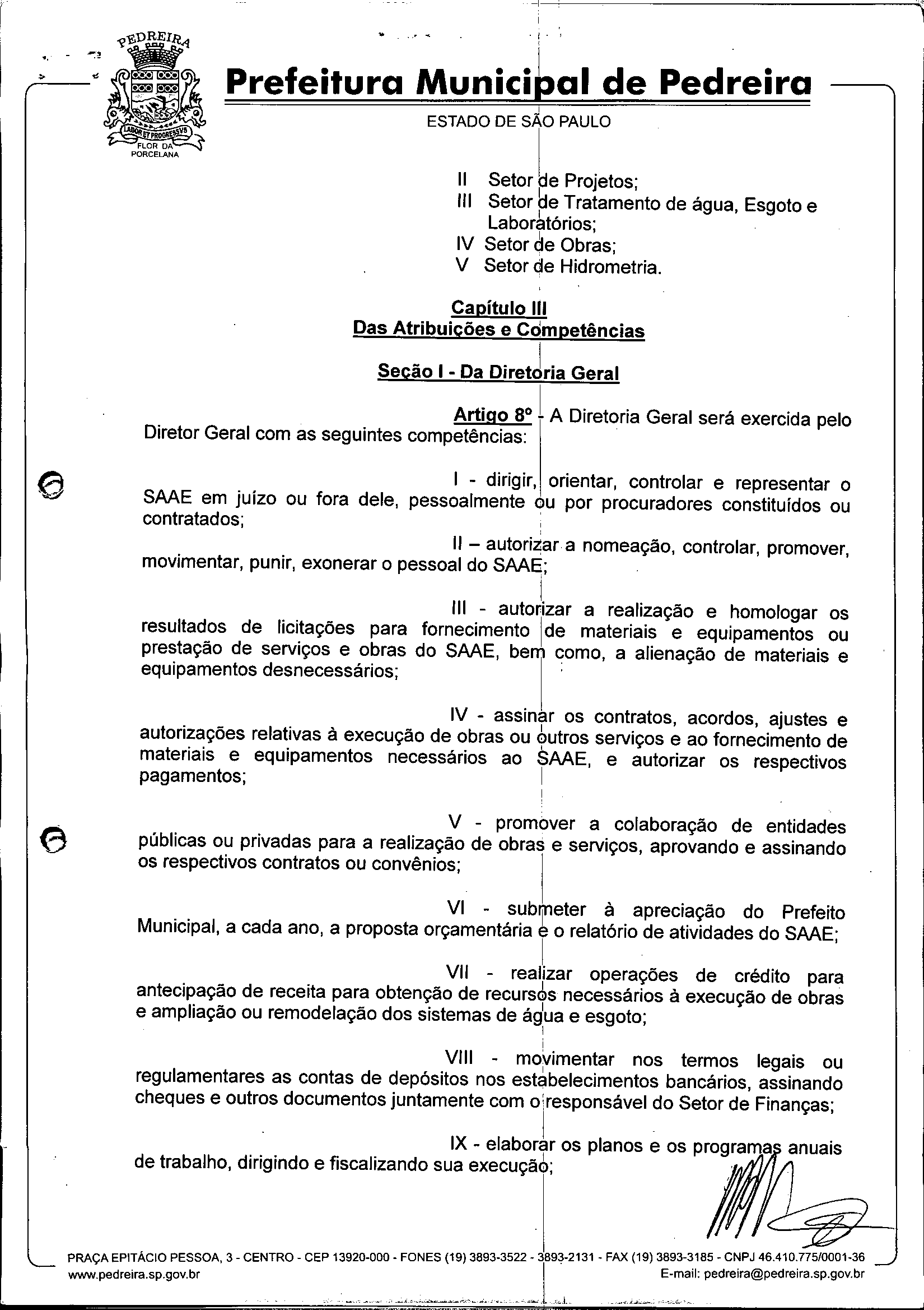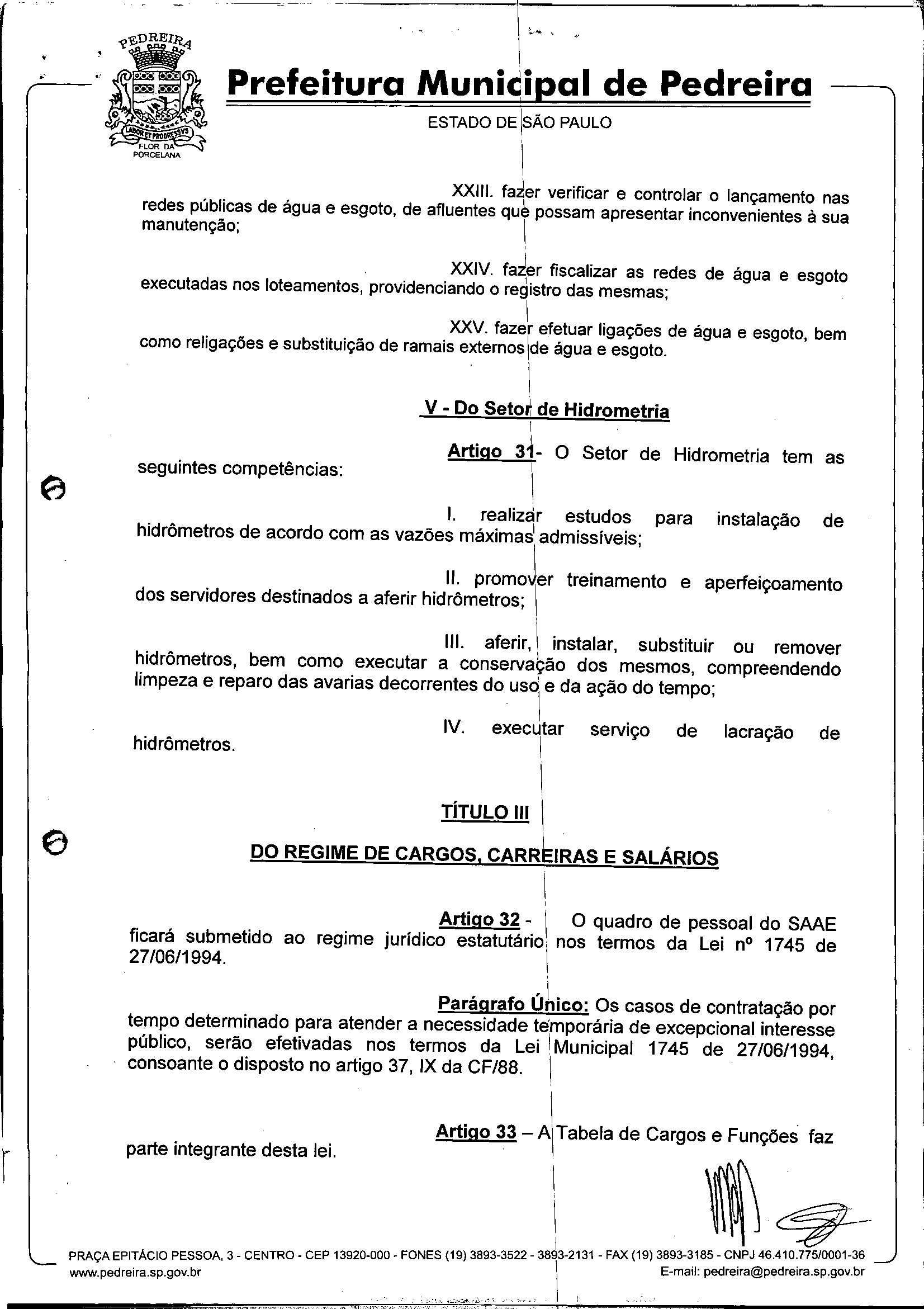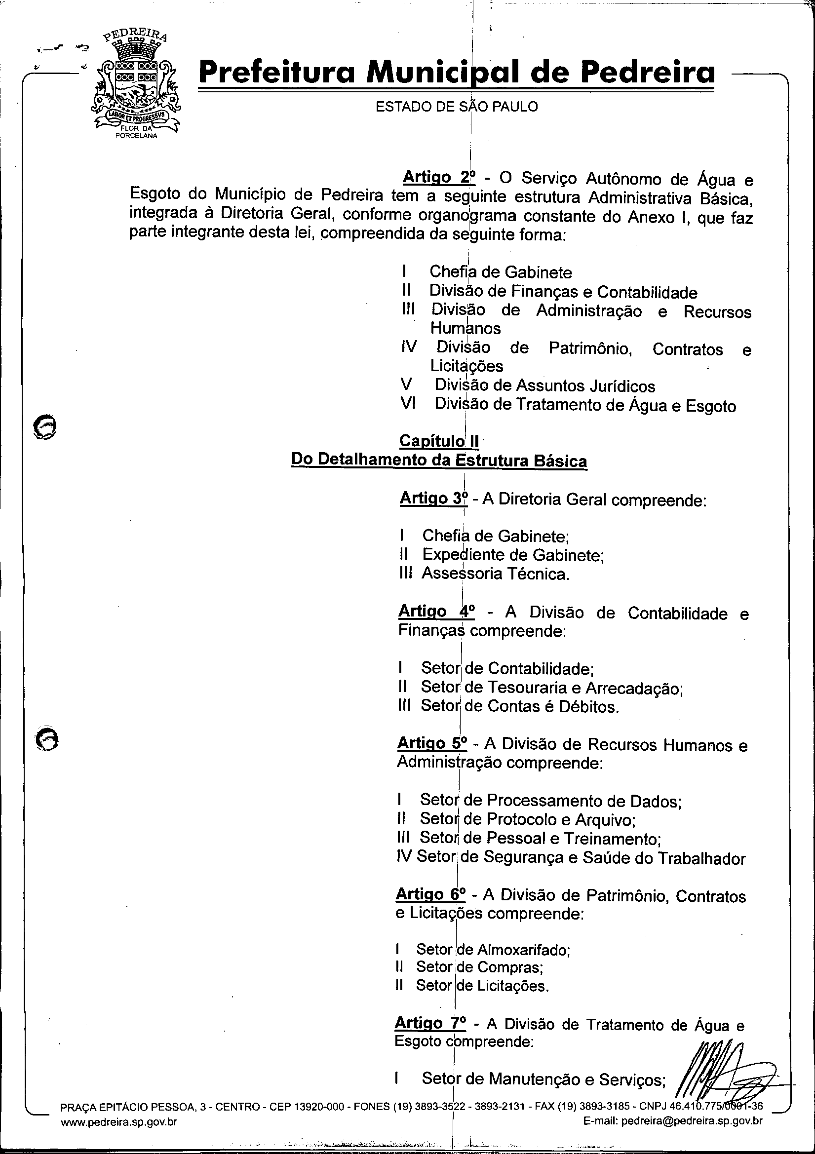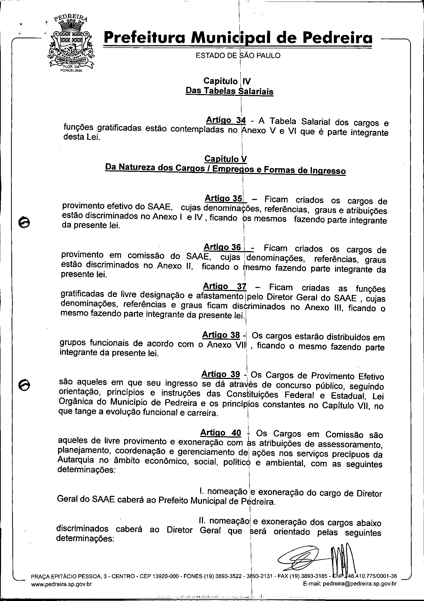 Ementa: Dispõe sobre o Regimento Interno e a estruturação administrativa e plano de cargos, empregos e salários do Serviço Autônomo de Água e Esgoto de Pedreira'- SAAE - e dá outras providências.