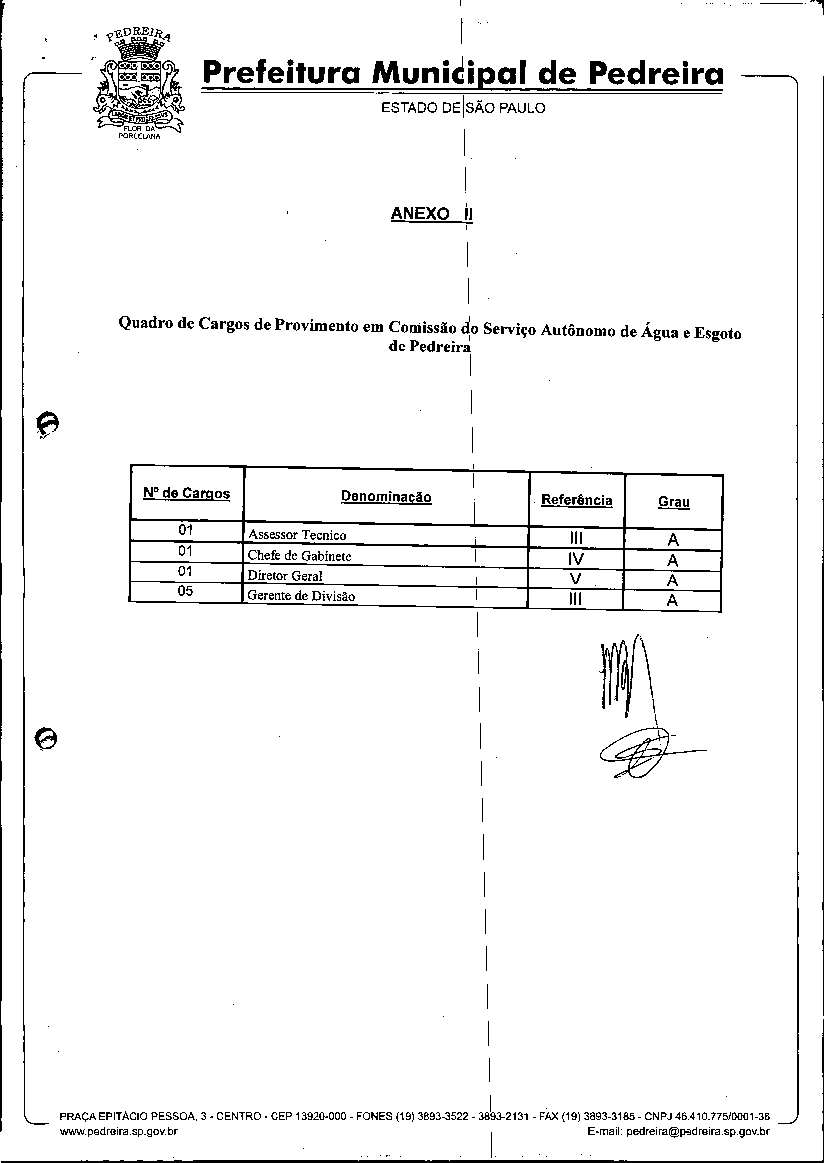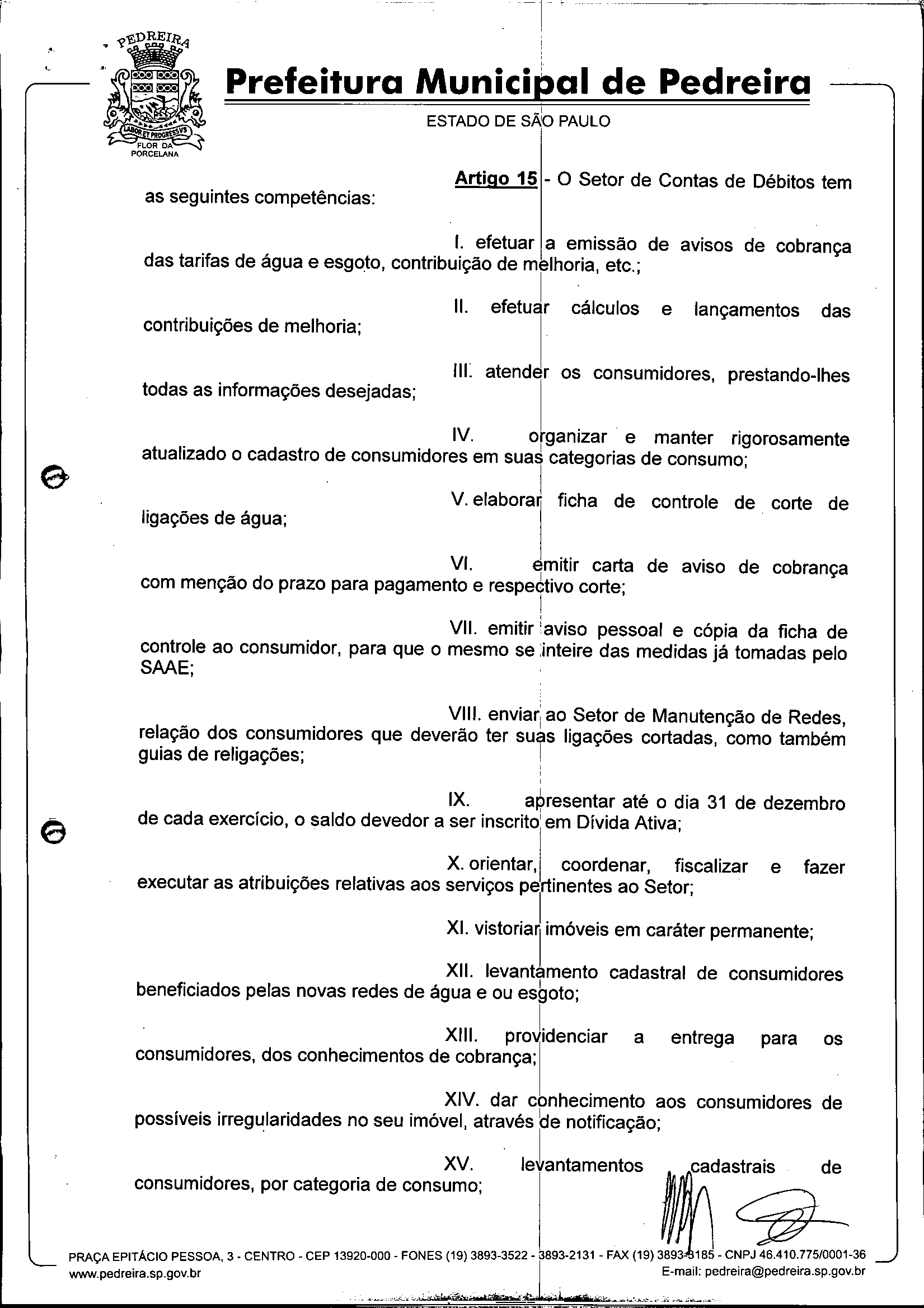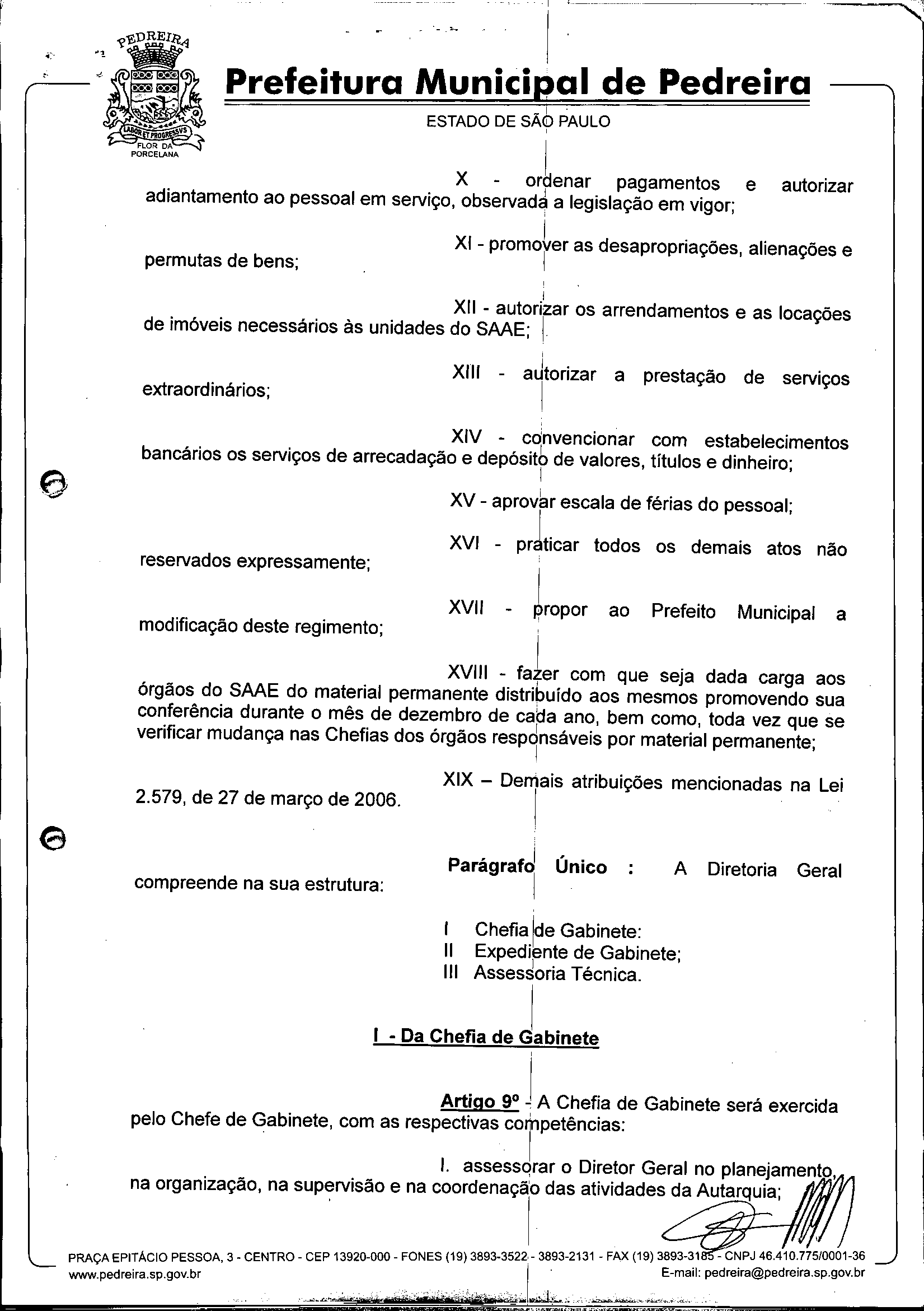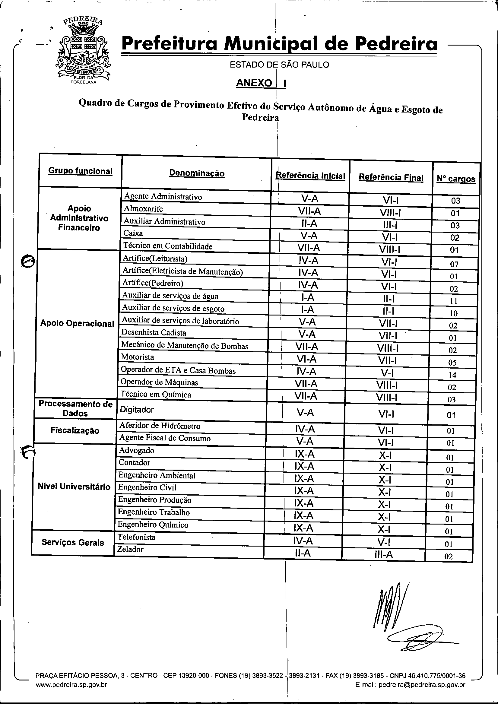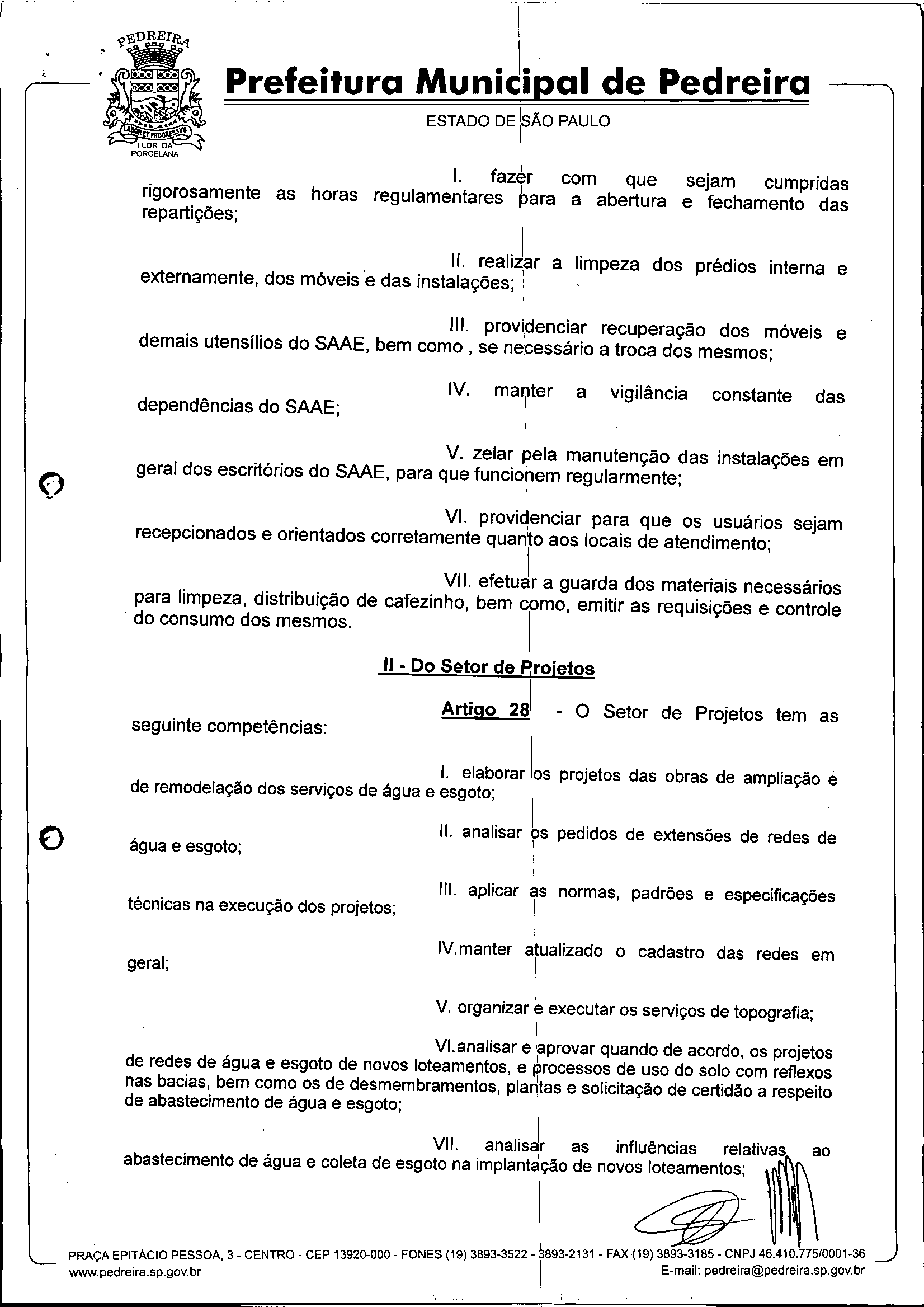Ementa: Dispõe sobre o Regimento Interno e a estruturação administrativa e plano de cargos, empregos e salários do Serviço Autônomo de Água e Esgoto de Pedreira'- SAAE - e dá outras providências.
