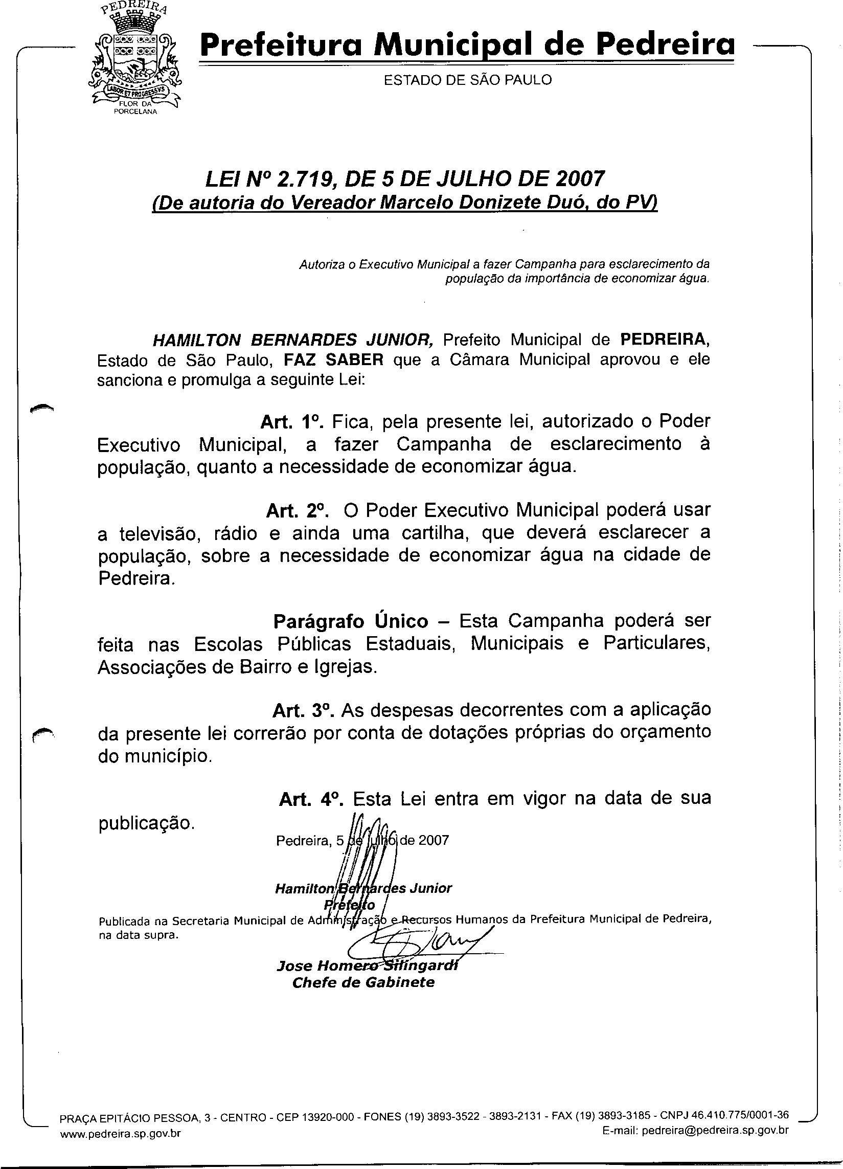 Lei Municipal - N° 2719 de 05/07/2007