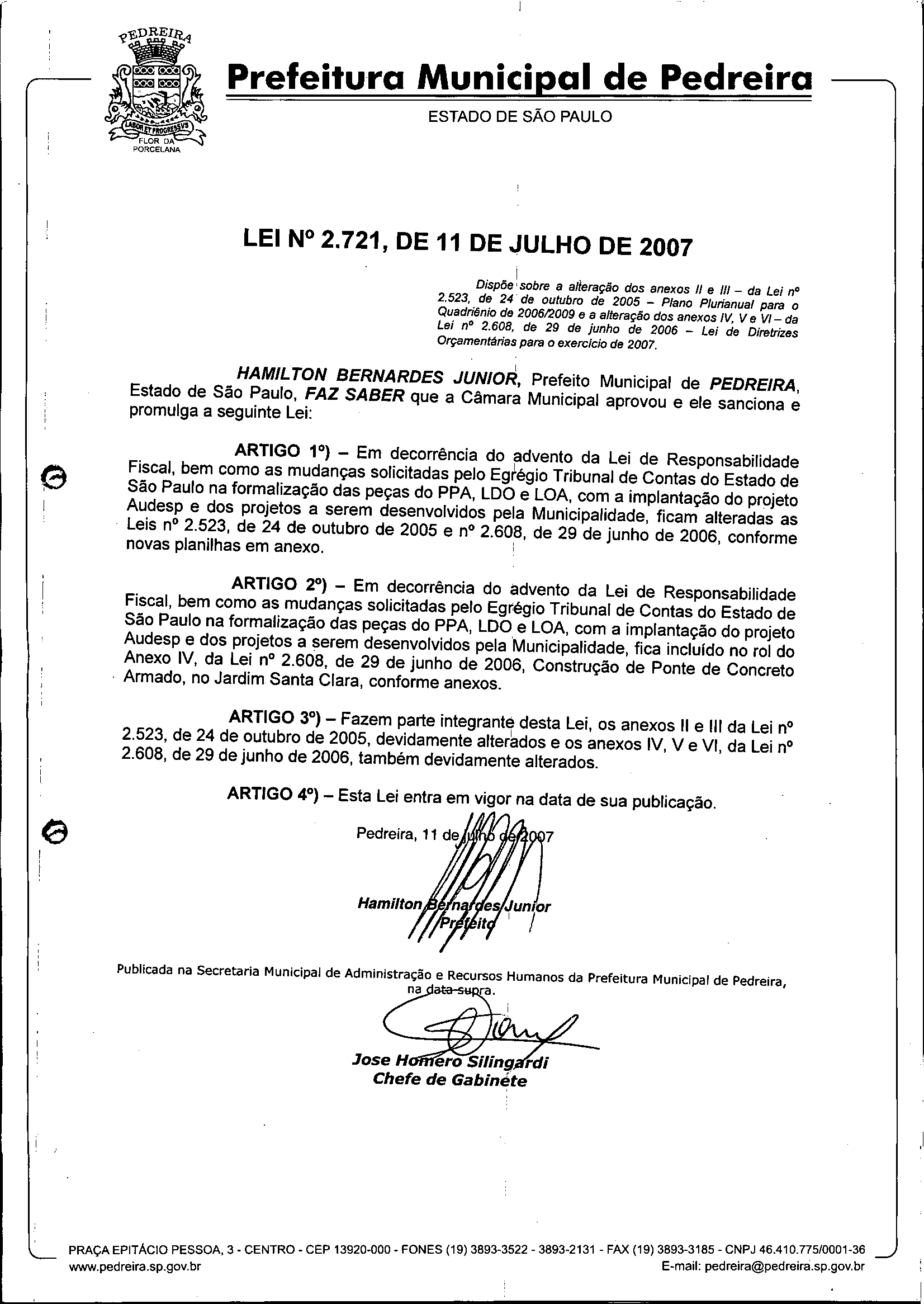 Lei Municipal - N° 2721 de 11/07/2007