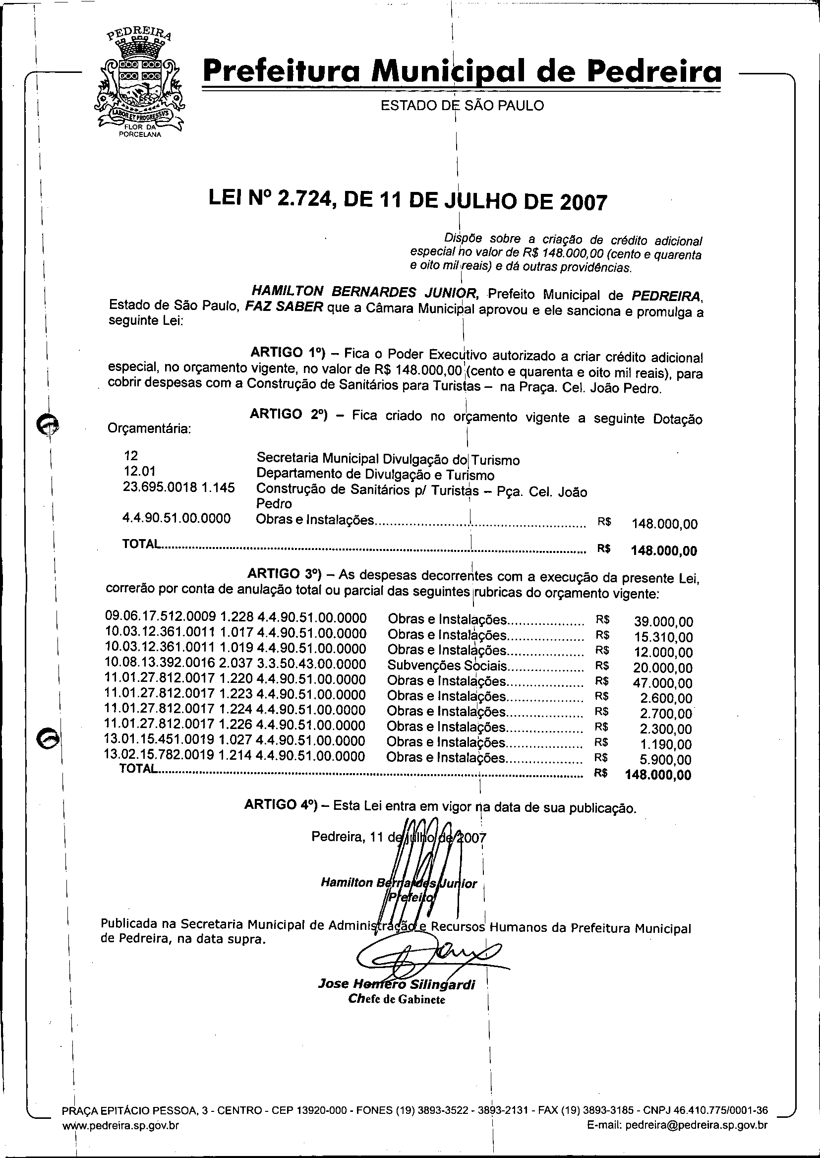 Ementa: Dispõe sobre a criação de crédito adicional especial no valor de R$148.000,00 (cento e quarenta e oito mihreais) e dá outras providências.