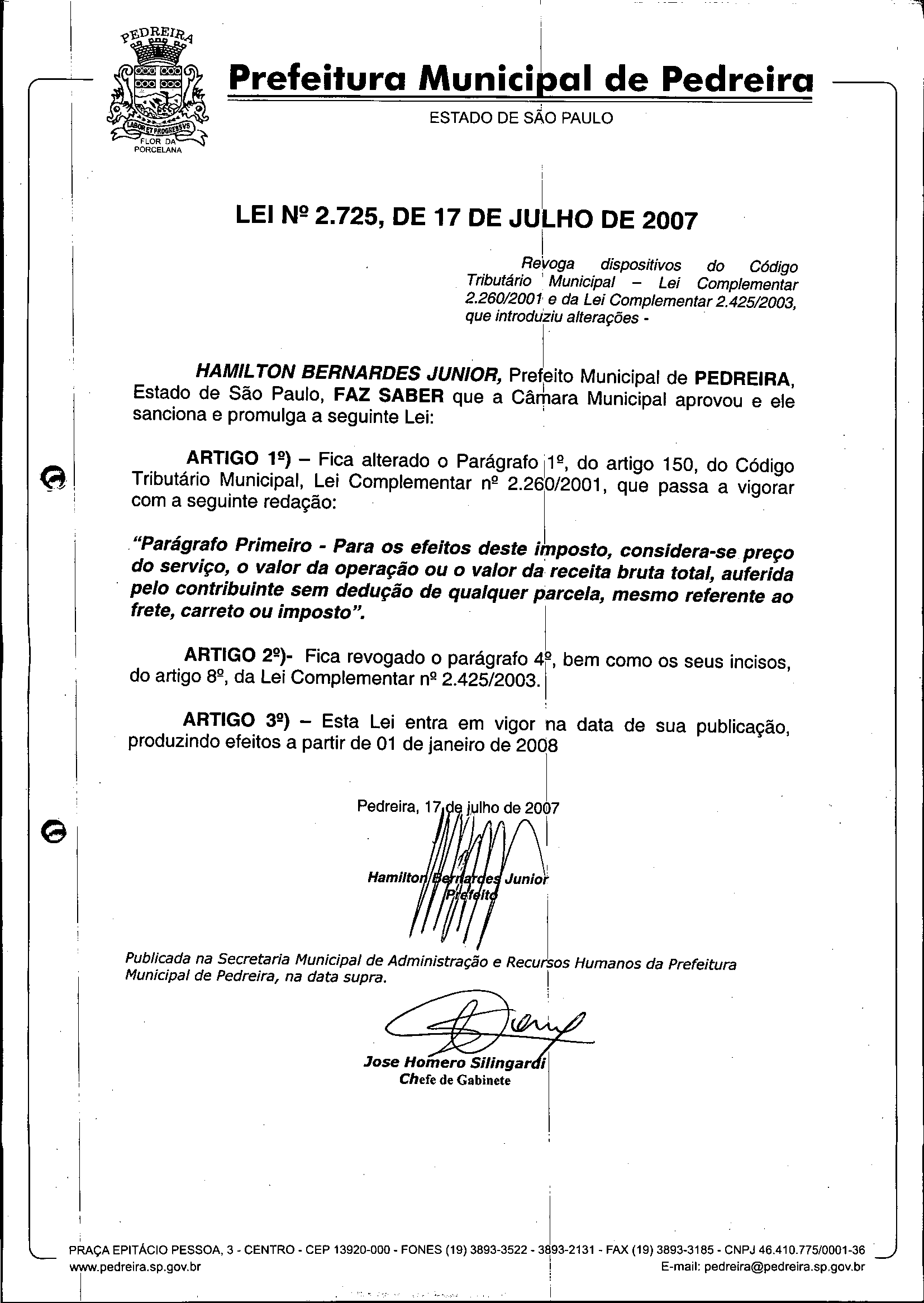 Lei Municipal - N° 2725 de 17/07/2007