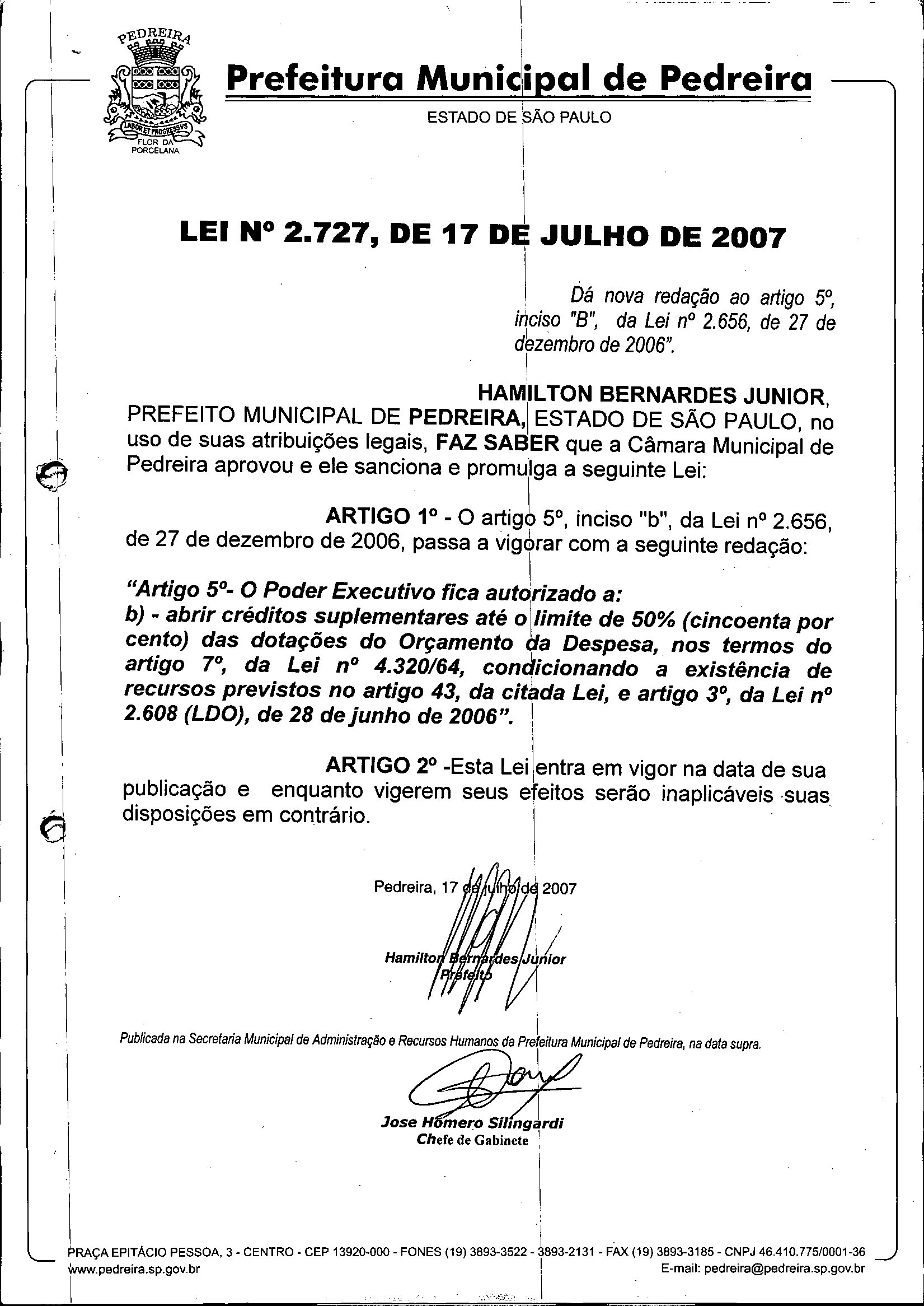 Ementa: Dá nova redação ao artigo 5° inciso "B", da Lei n° 2.656, de 27 de dezembro de 2006".