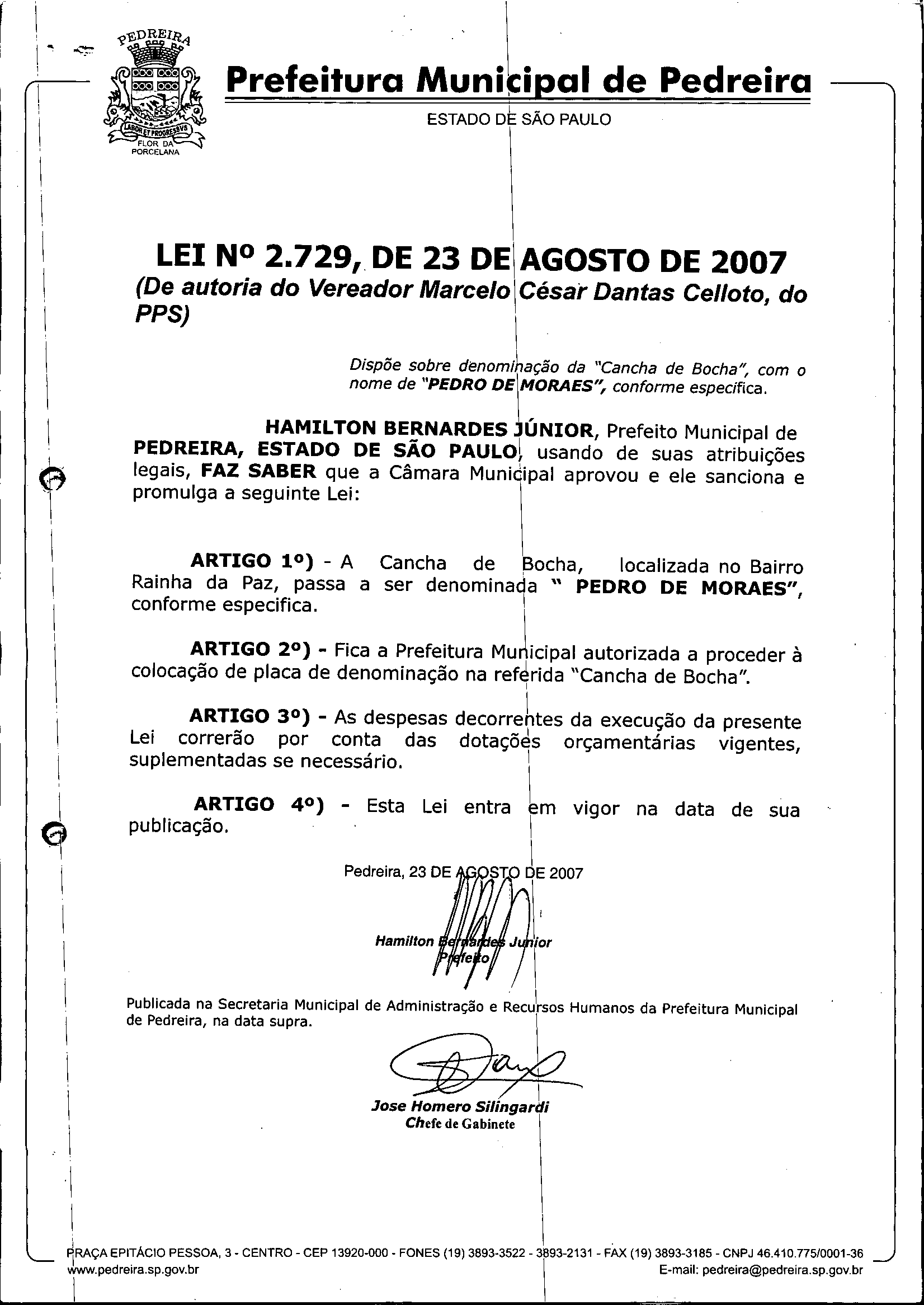 Lei Municipal - N° 2729 de 23/08/2007