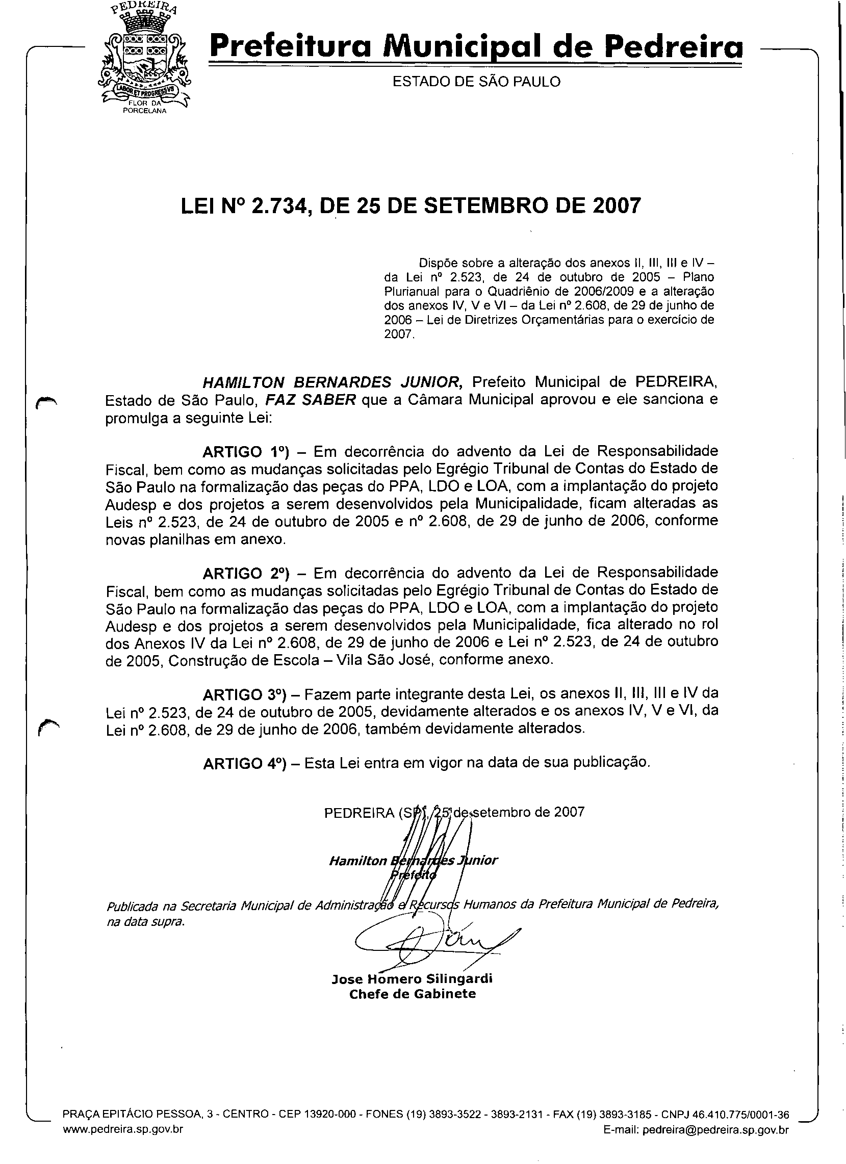 Lei Municipal - N° 2734 de 25/09/2007