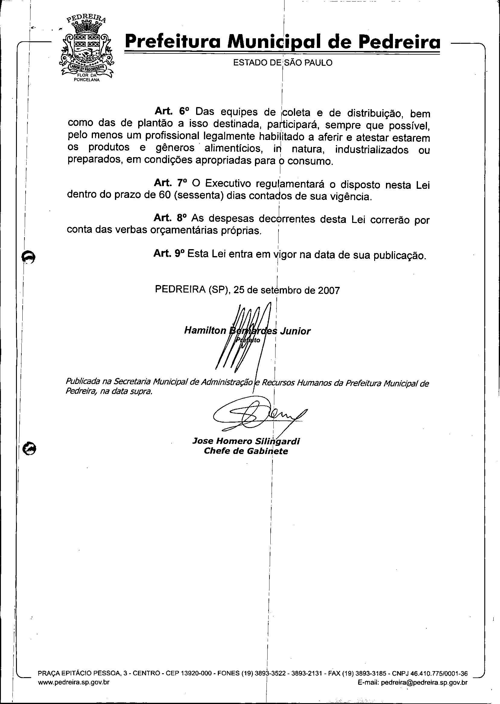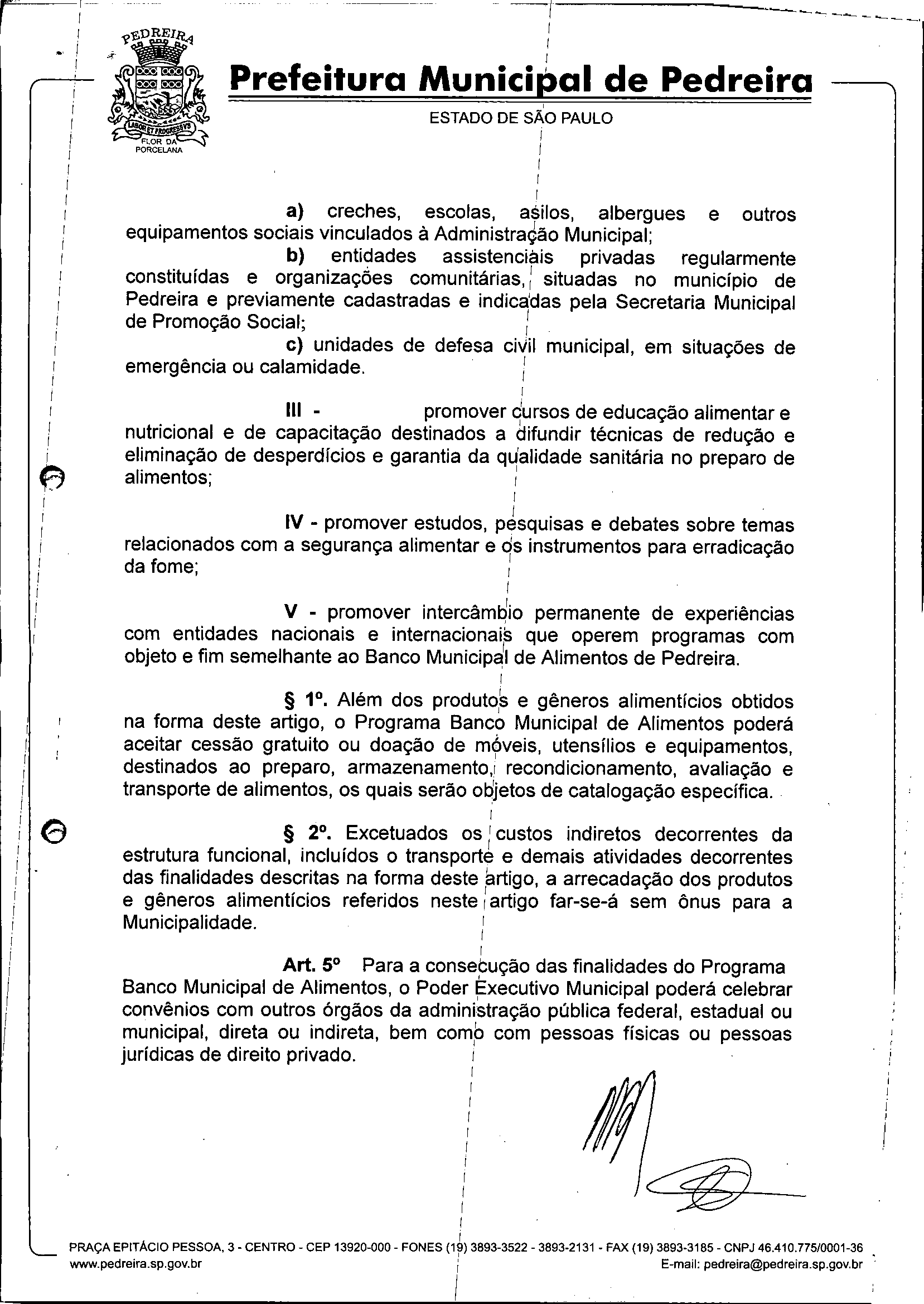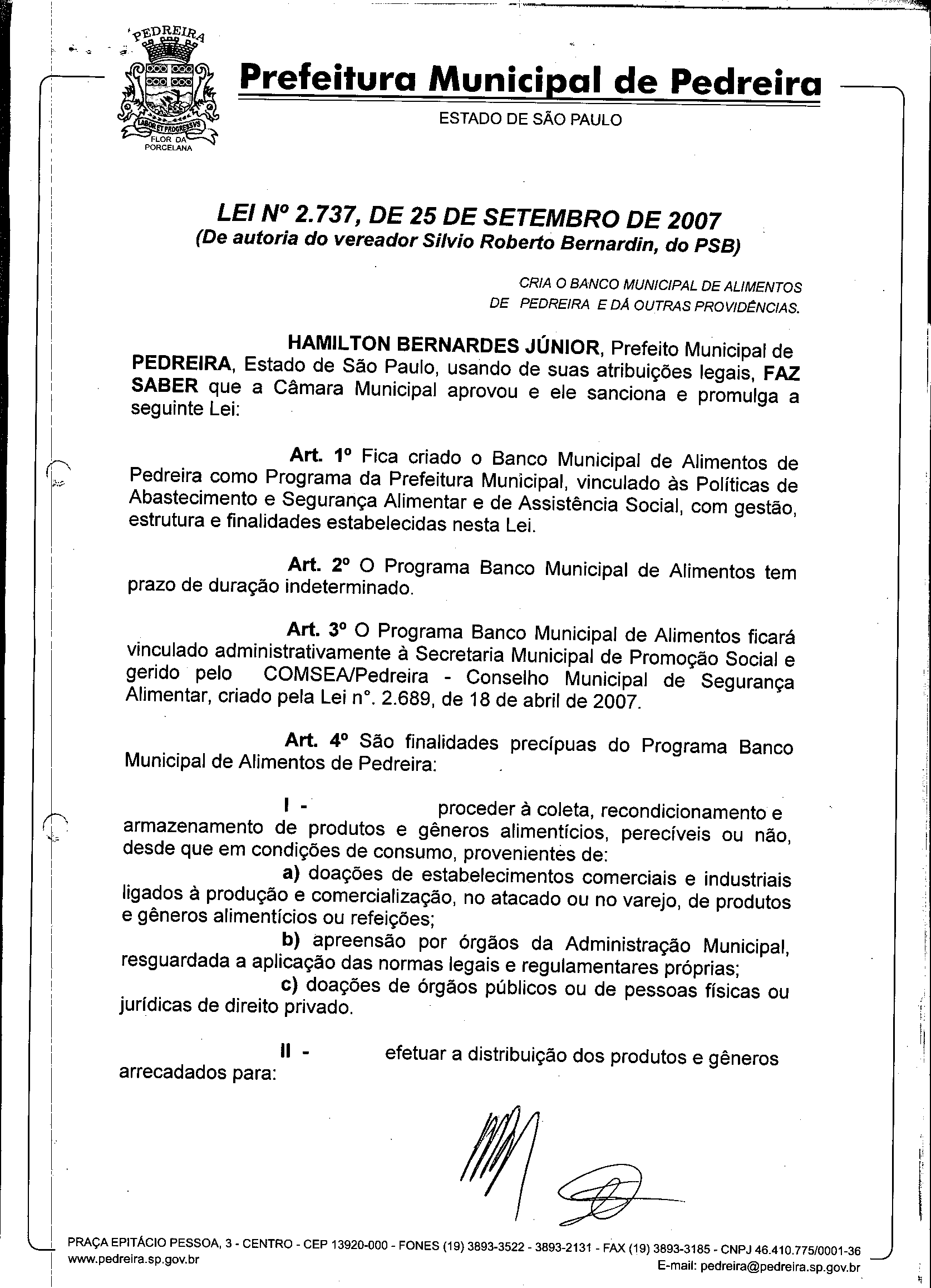 Ementa: CRIA O BANCO MUNICIPAL DE ALIMENTOS DE PEDREIRA E DA OUTRAS PROVIDÊNCIAS.