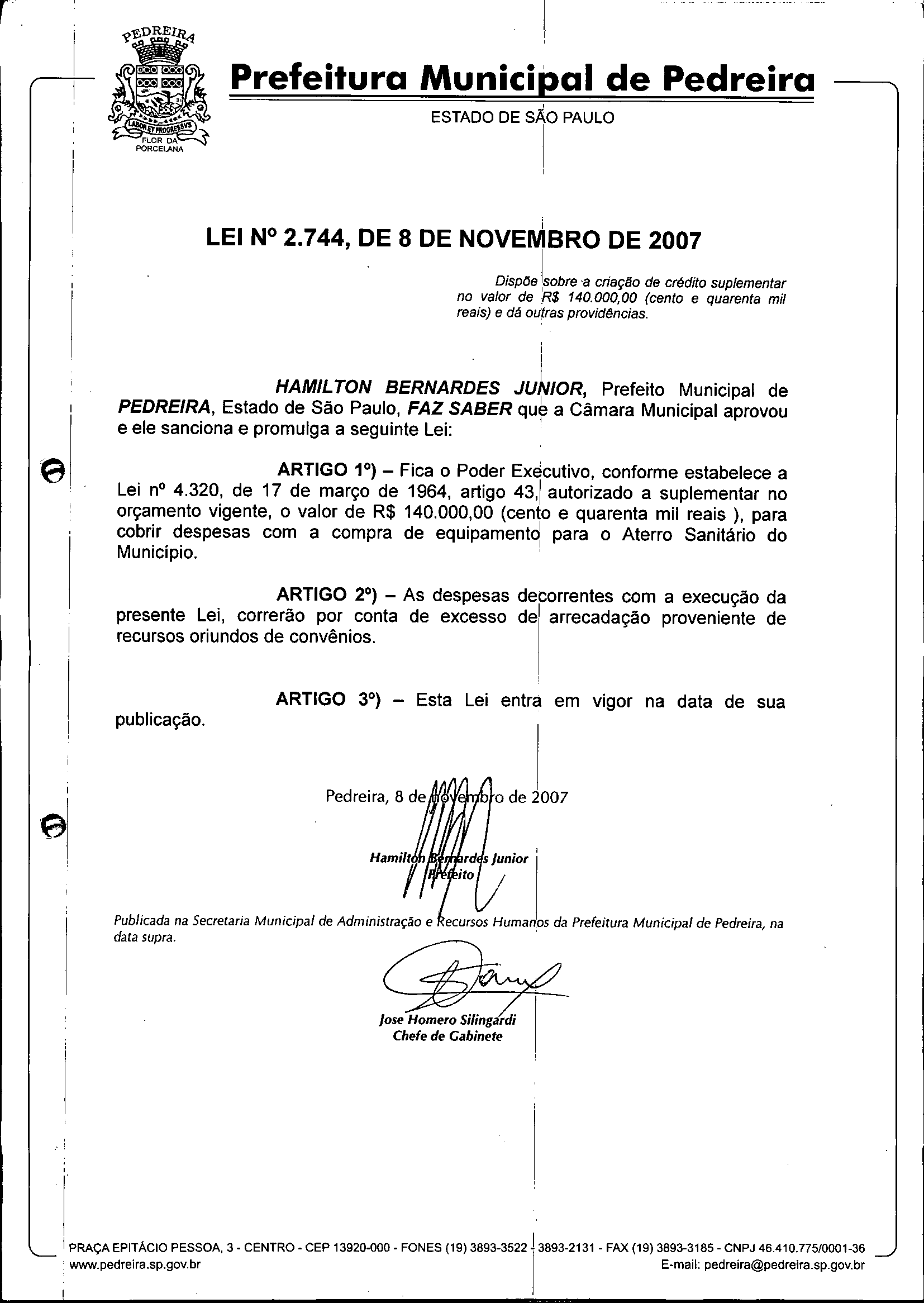 Ementa: Dispõe sobre a criação de crédito suplementar no valor de R$ 140.000,00 (cento e quarenta mil reais} e dá outras providências.