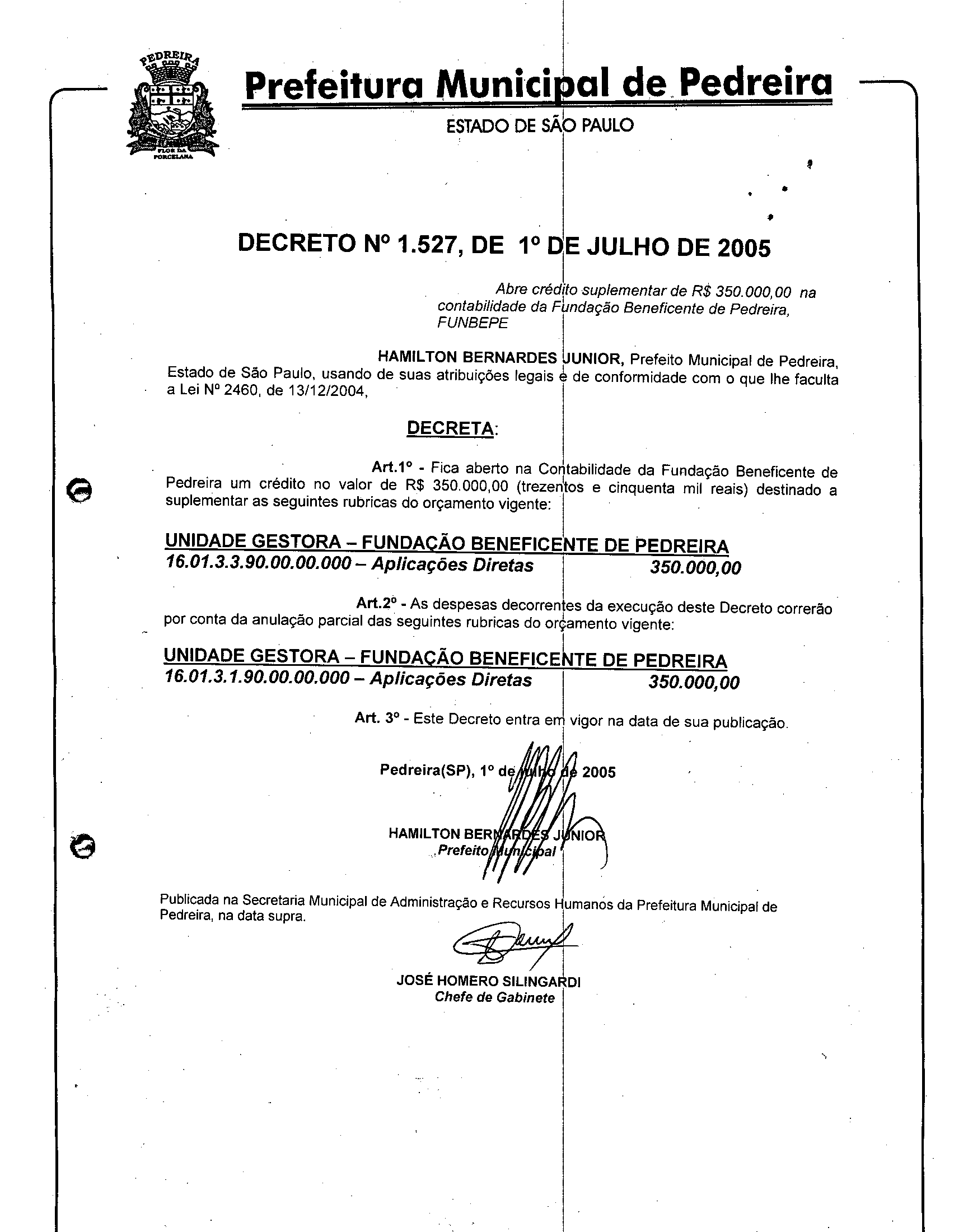 Ementa: Abre crédto suplementar de R$ 350.000,00 na contabilidade da Fundação Beneficente de Pedreira, FUNBEPE