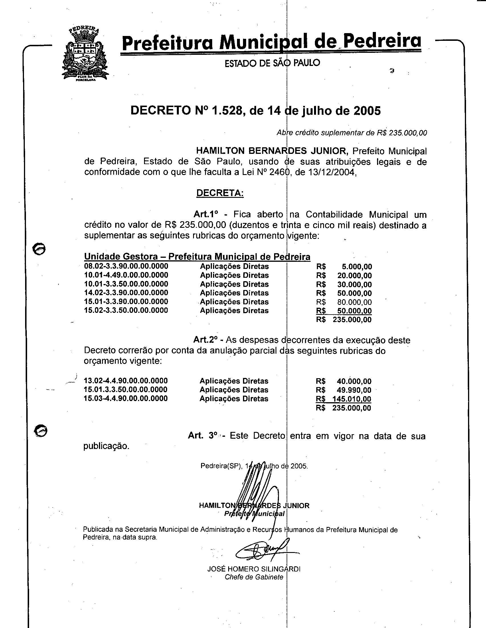 Ementa: Abre crédito suplementar de R$ 235.000,00.