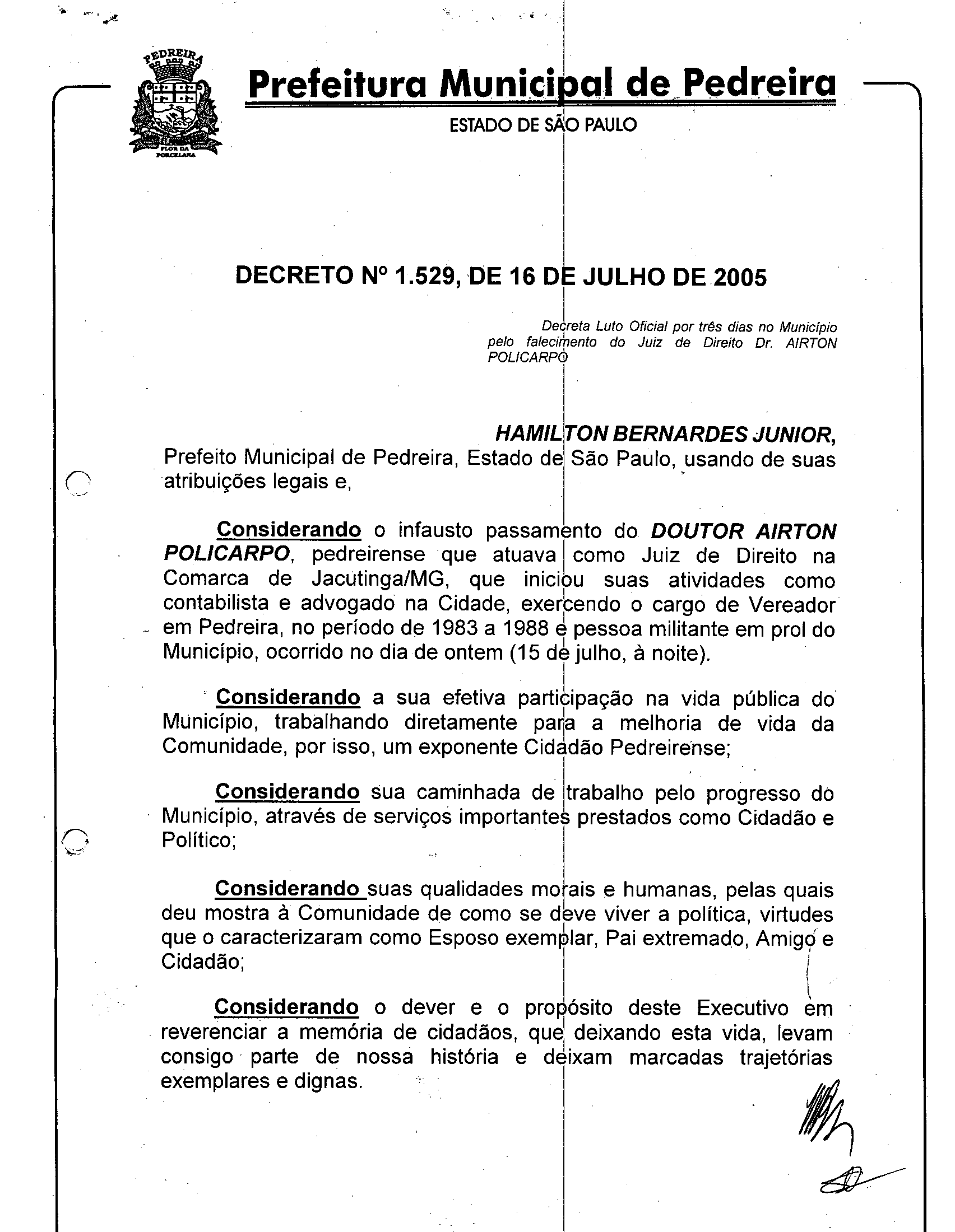 Ementa: Declara Luto Oficial por três dias no Município pelo falecimento do Juiz de Direito Dr. AÍRTON POLICARPO.