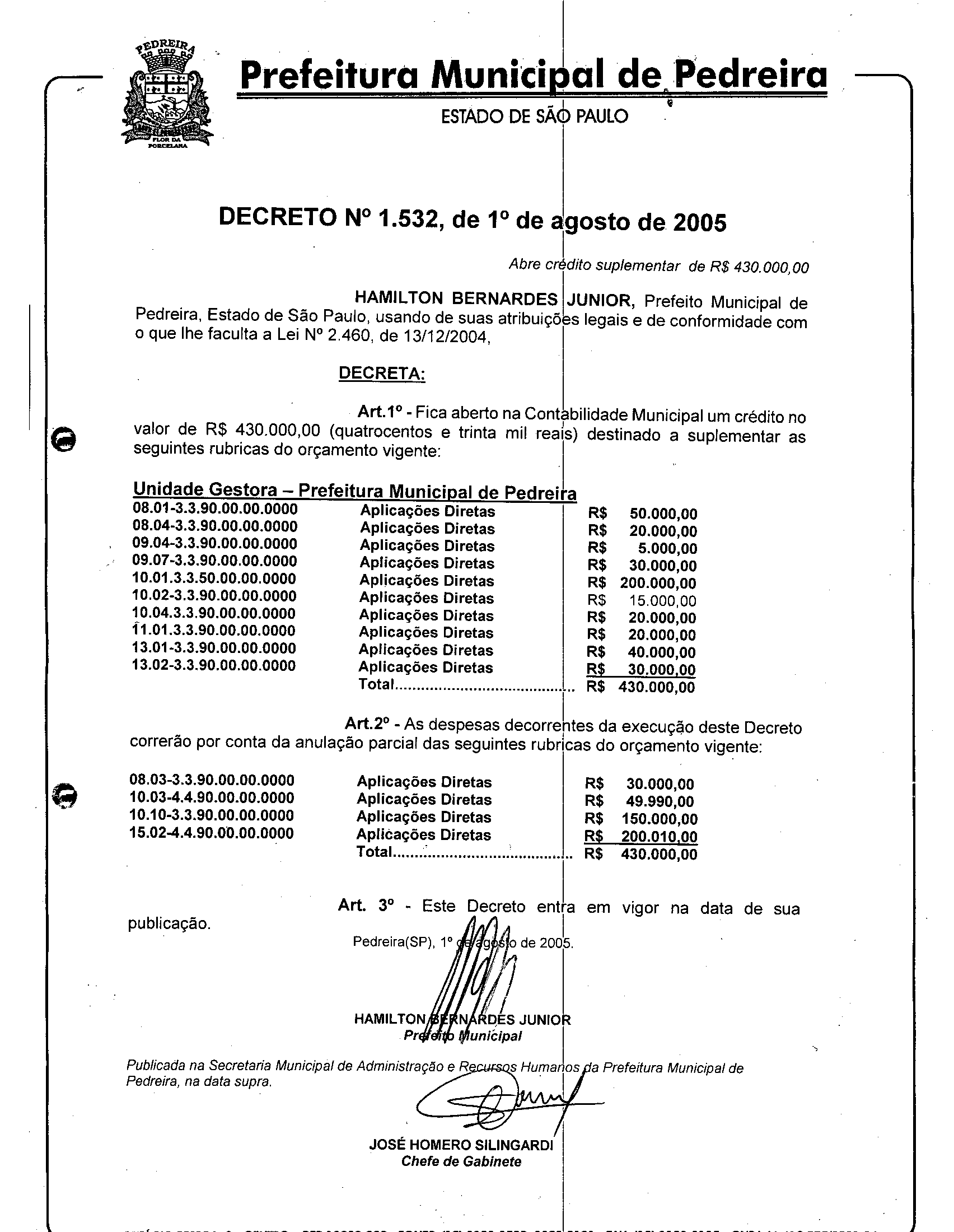 Ementa: Abre crédito suplementar de R$ 430.000,00.