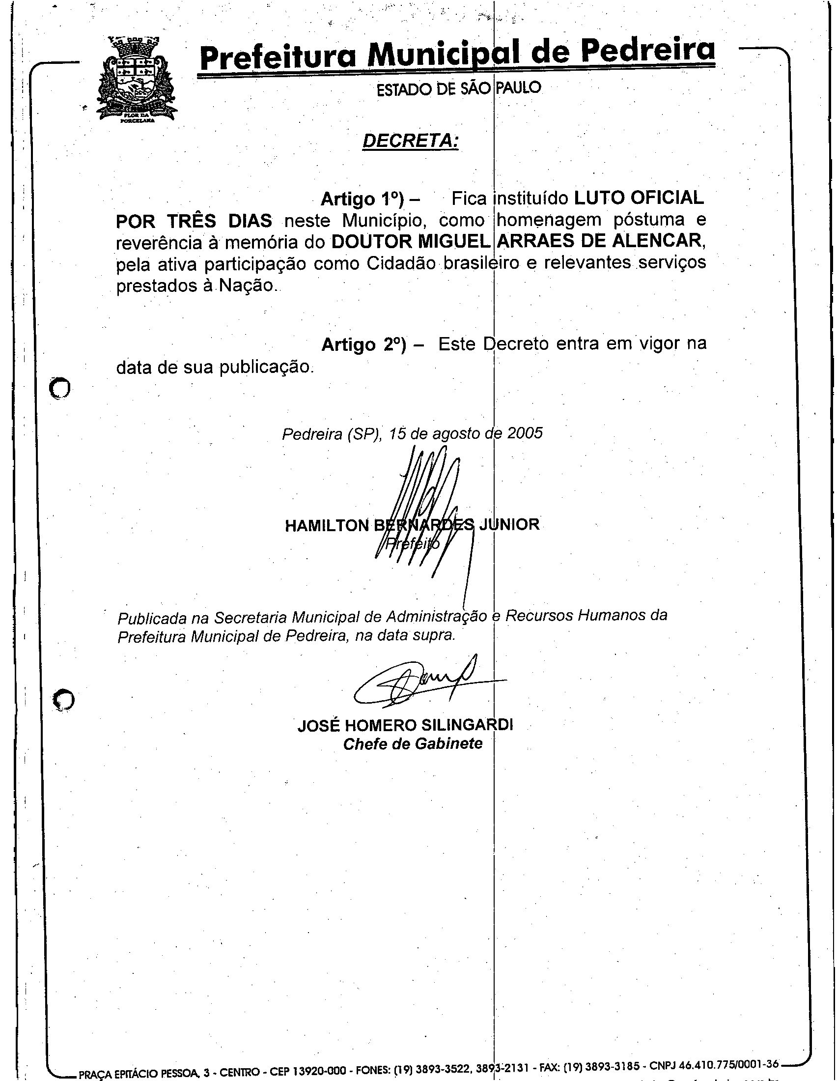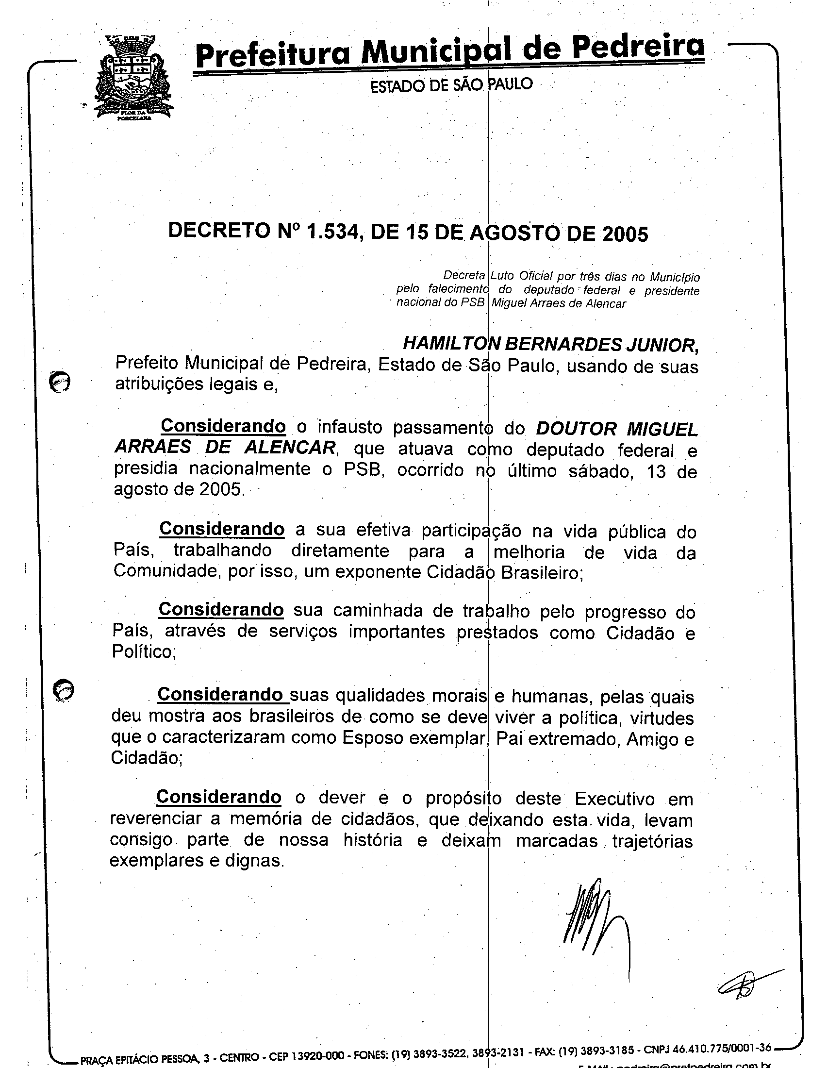 Ementa: Decreta Luto Oficial por três dias no Município pelo falecimento do deputado federal e presidente nacional do PSB Miguel Arraes de Alencar.
